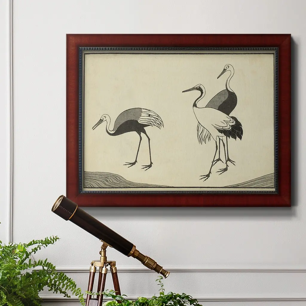 Japanese Cranes B Premium Framed Canvas- Ready to Hang A Premium Framed Canvas created to last. Framed in distressed wood and available in an array of sizes and colors Featuring a beveled a solid wood stretcher bar, each piece comes ready to hand 3 SIZES AVAILABLE 16''X20'' - Overall Size 18'X27'' - Overall Size 24''x36'' - Overall Size Each piece is made to order. Each piece comes with hanging hardware. Made in the USA Ready to Hang Giclee Paper Print Acrylic Glass Beveled Matt Board