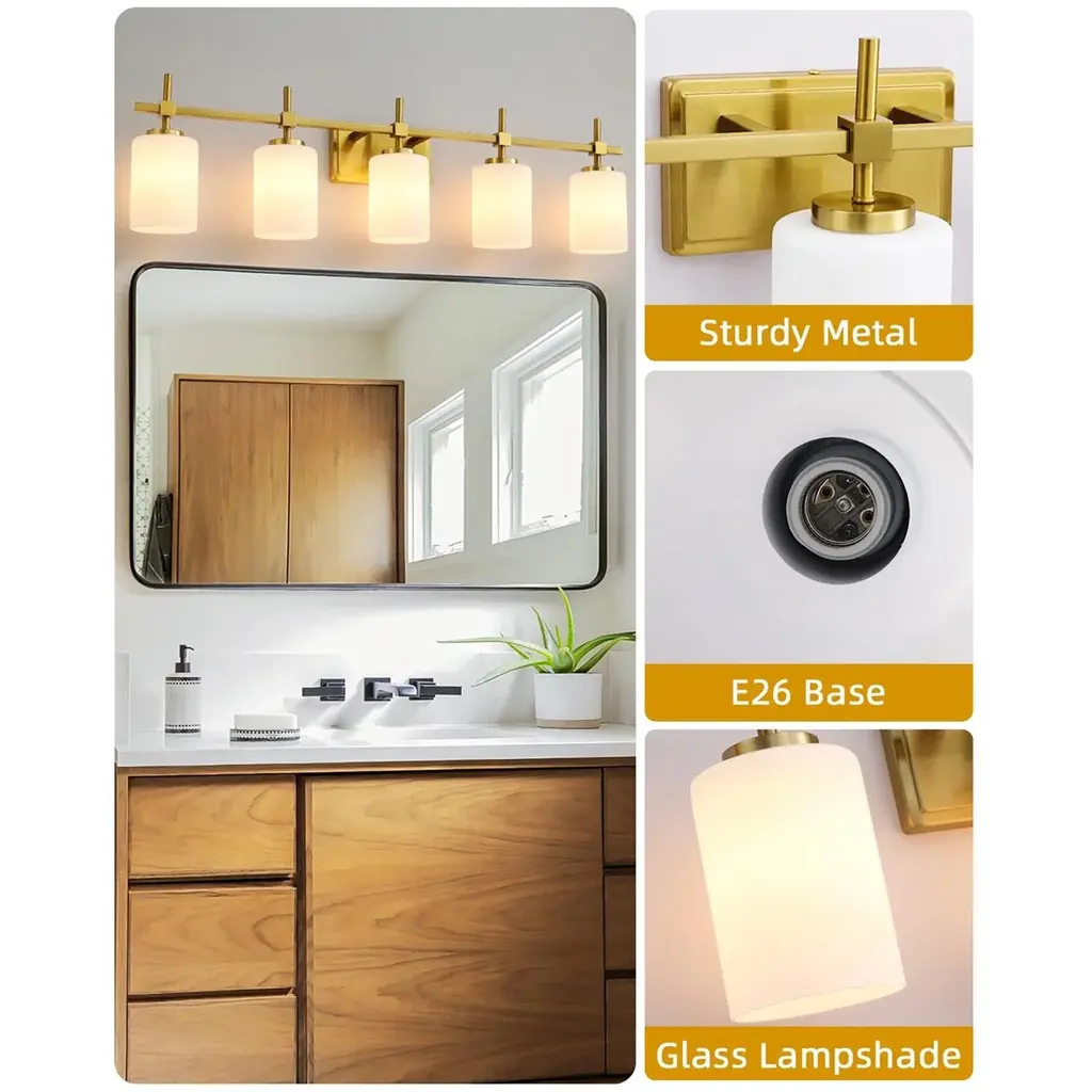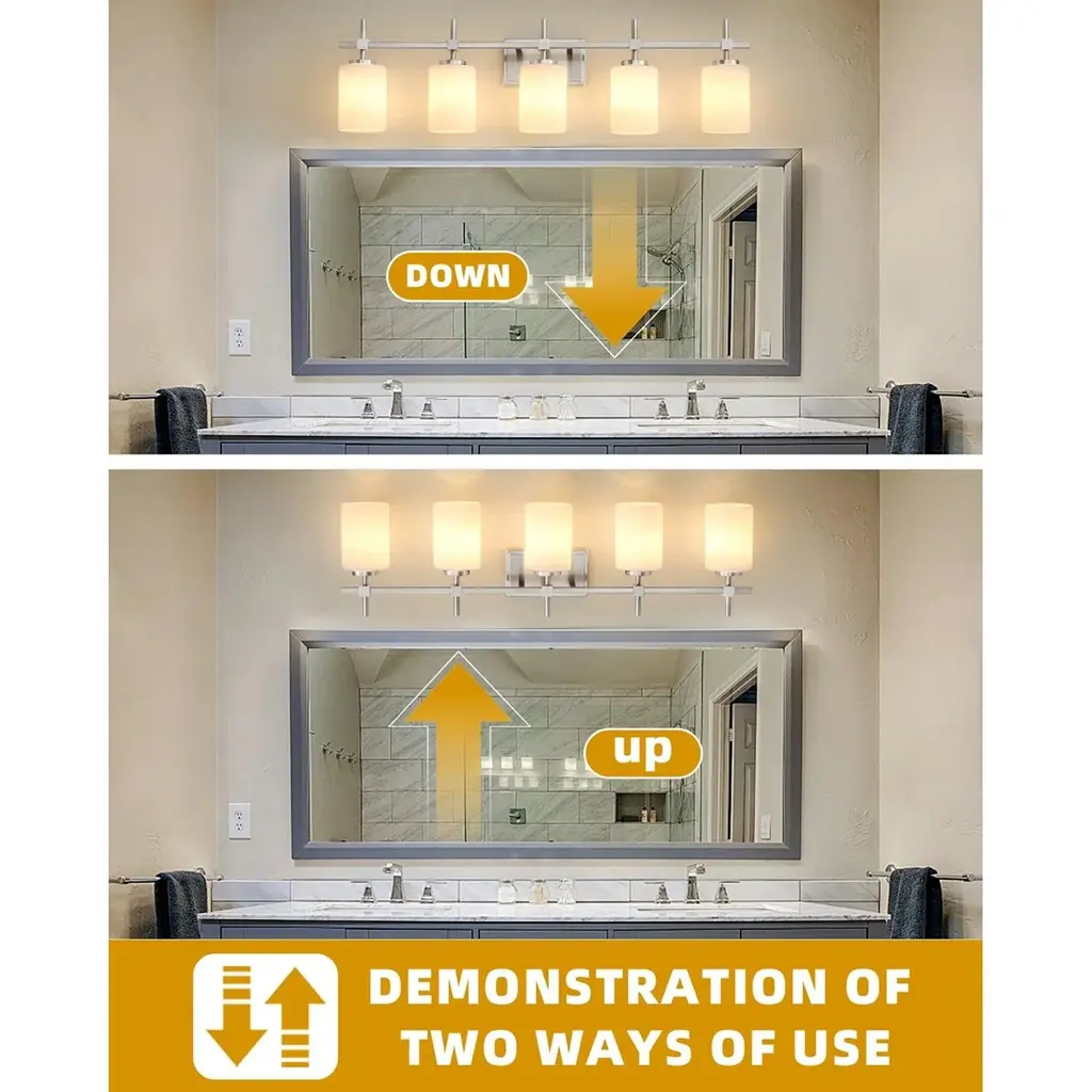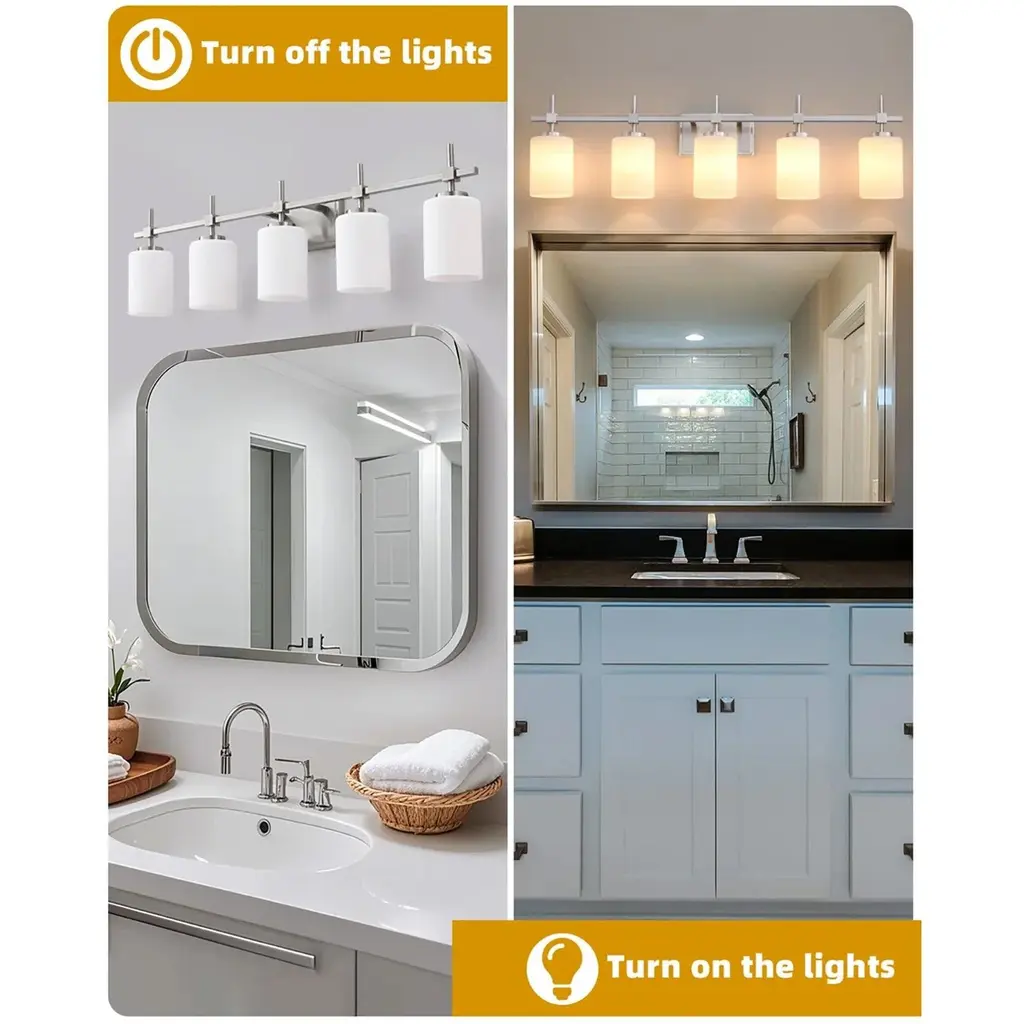 Elevate your bathroom with these elegant vanity lights, crafted from sturdy metal and glass with oxidation-resistant finishes, featuring dimmable E26 bulbs (60W max) for a soft, romantic glow.【Modern Design】 : Combines sturdy metal and high-quality glass for a sleek, minimalist look.【Dimmable Compatibility】 : Works with dimmer switches and dimmable bulbs (not included) for adjustable lighting.【Durable Materials】 : Oxidation-resistant metal and flawless glass ensure long-lasting beauty.【Versatile Bulb Support】 : Accommodates E26 bulbs (60W max per light) for bright or soft illumination.【Damp-Rated】 : This modern vanity lamp has been damp-rated for moisture, which means it can be used safely in damp environments such as bathrooms without being damaged.