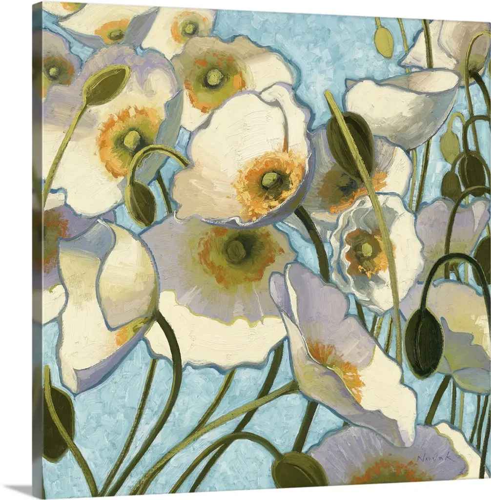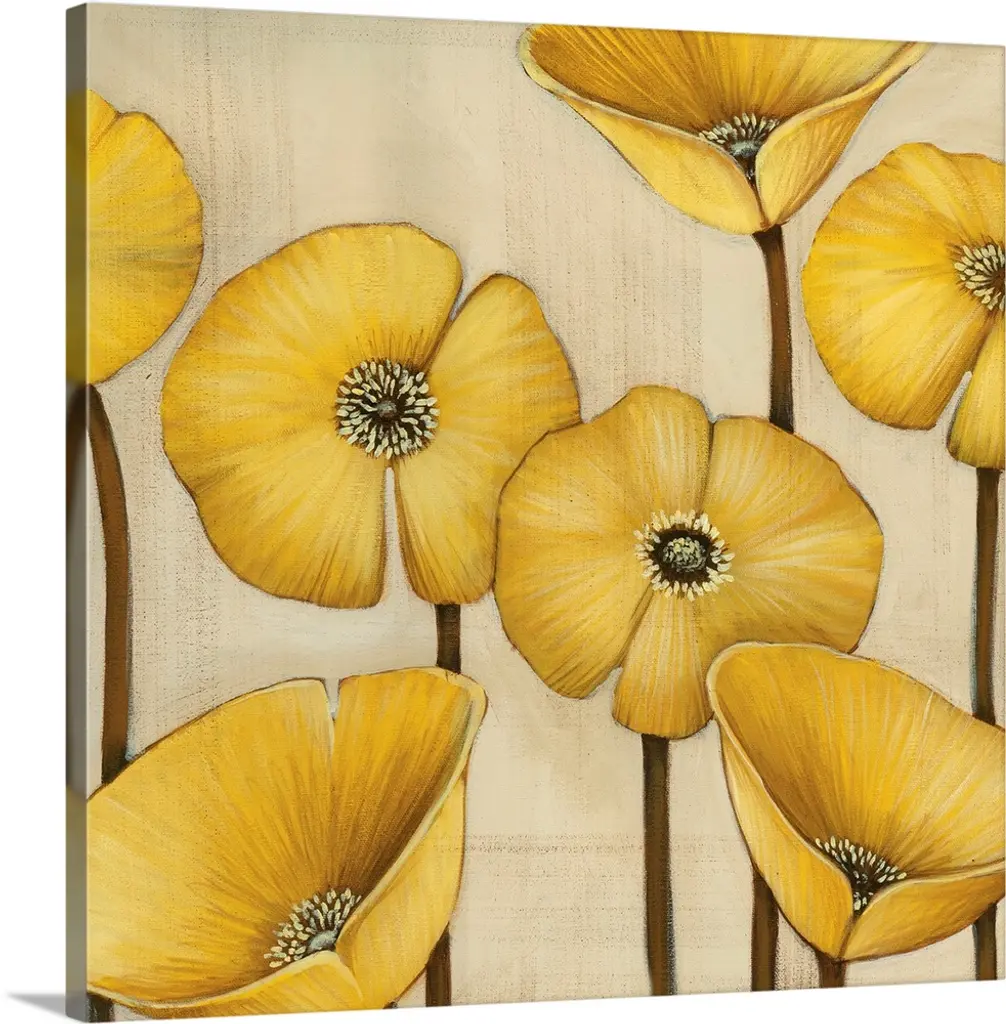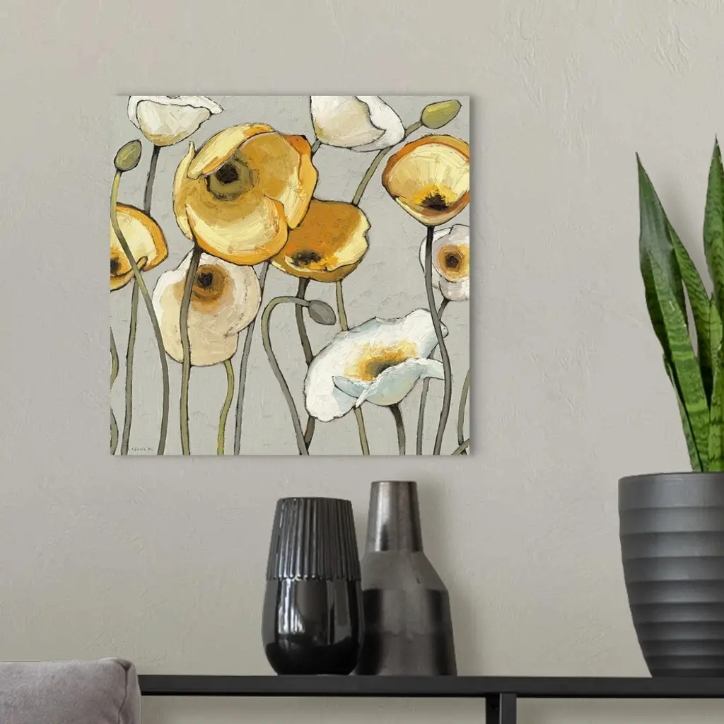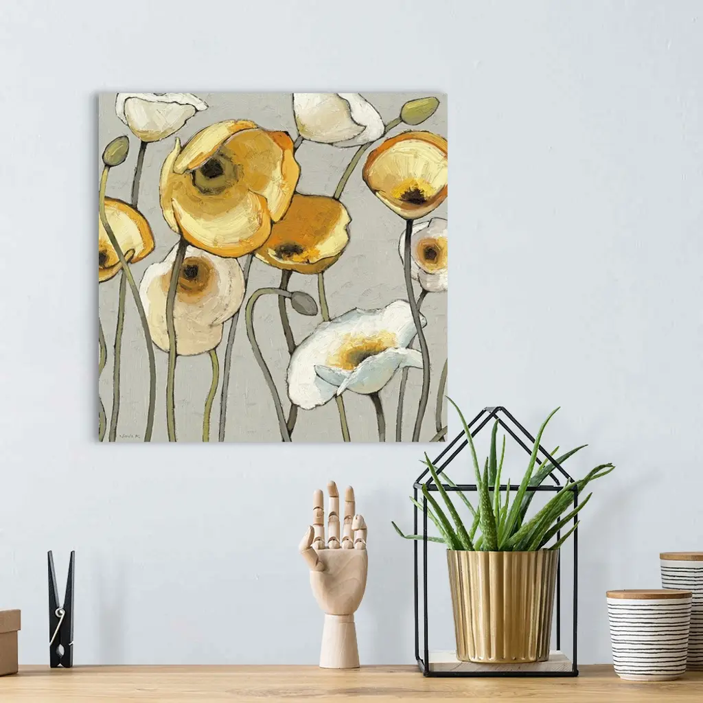 Oversized, square contemporary painting of a group of poppies in light and golden colors, extending upwards on a solid background. Painted with thick brushstrokes.