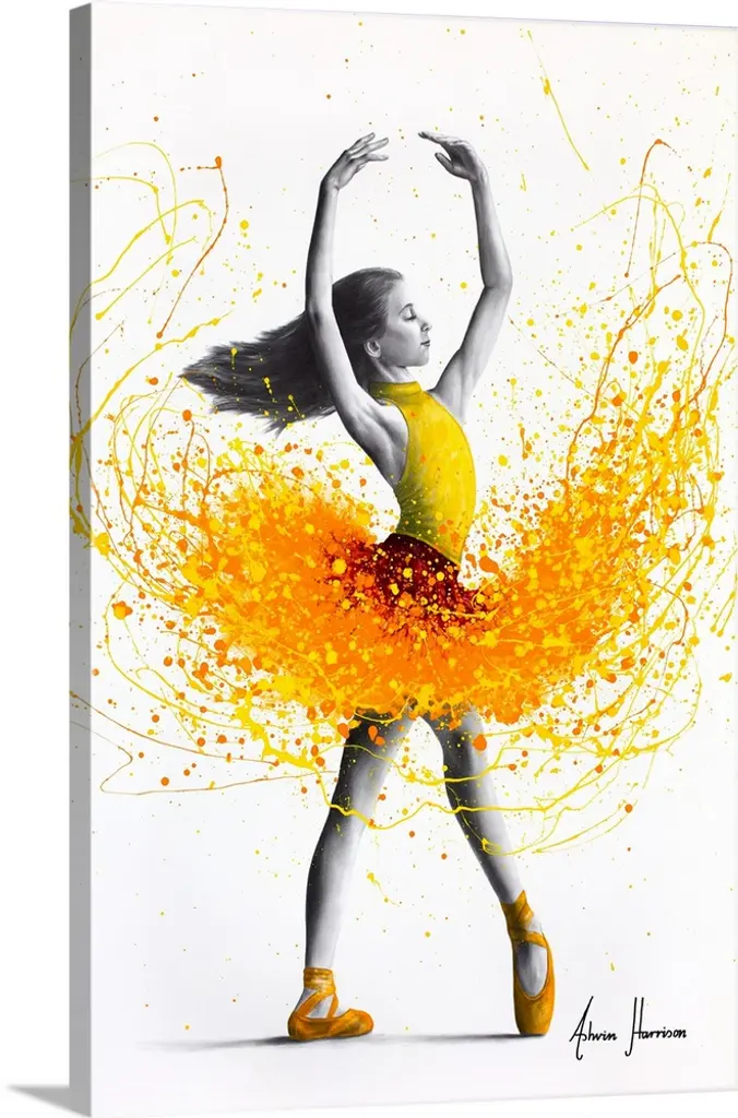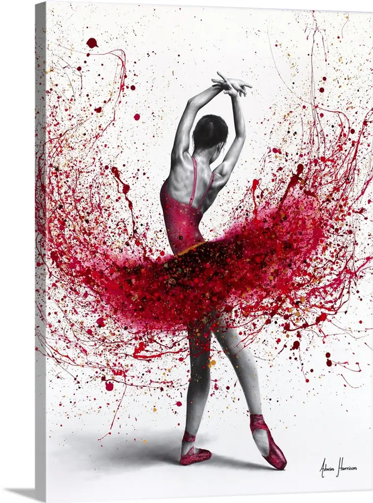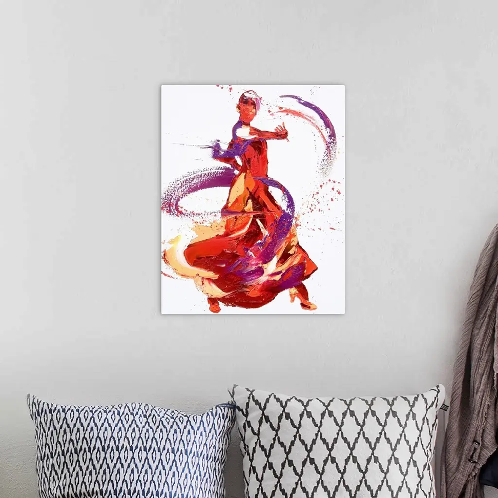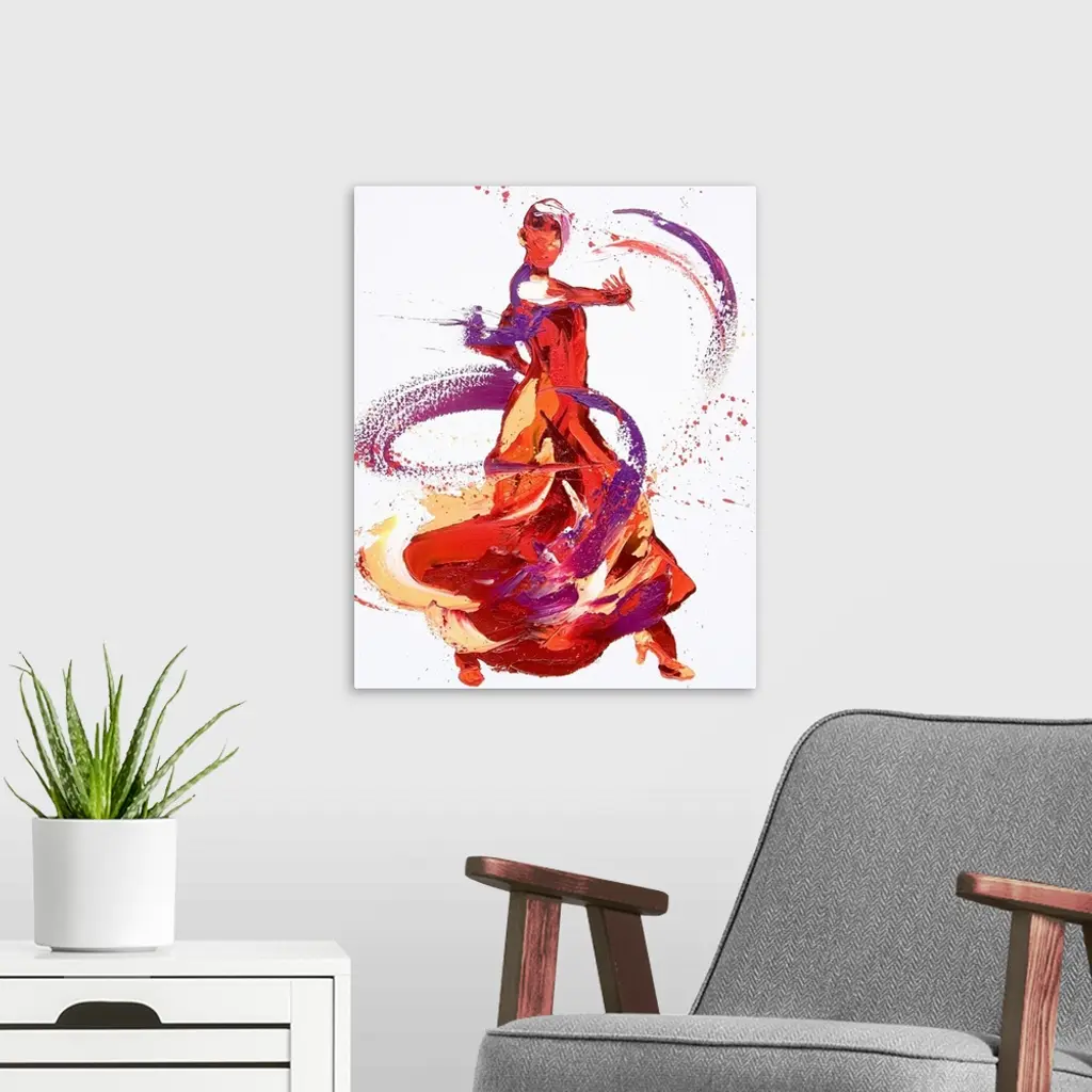 Contemporary painting using deep warm colors to create a woman dancing against a white background.