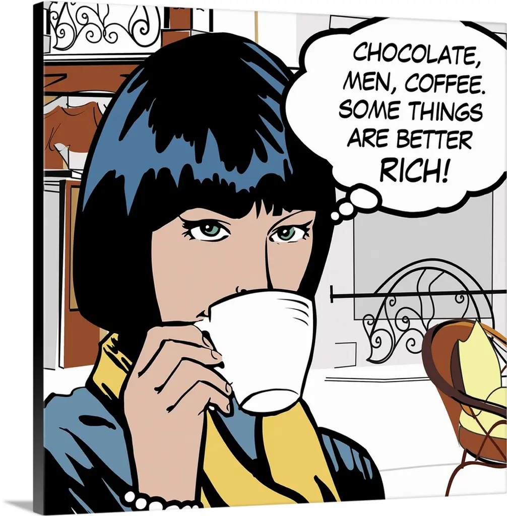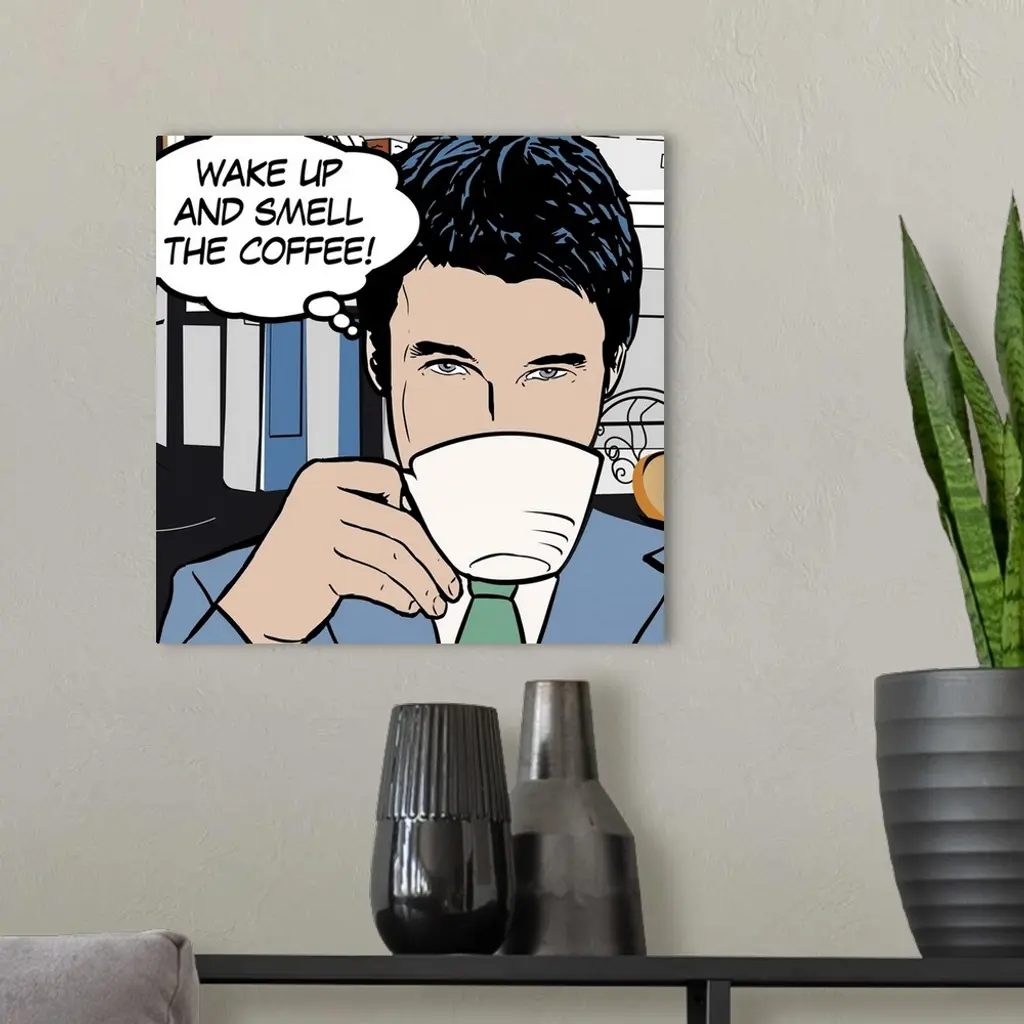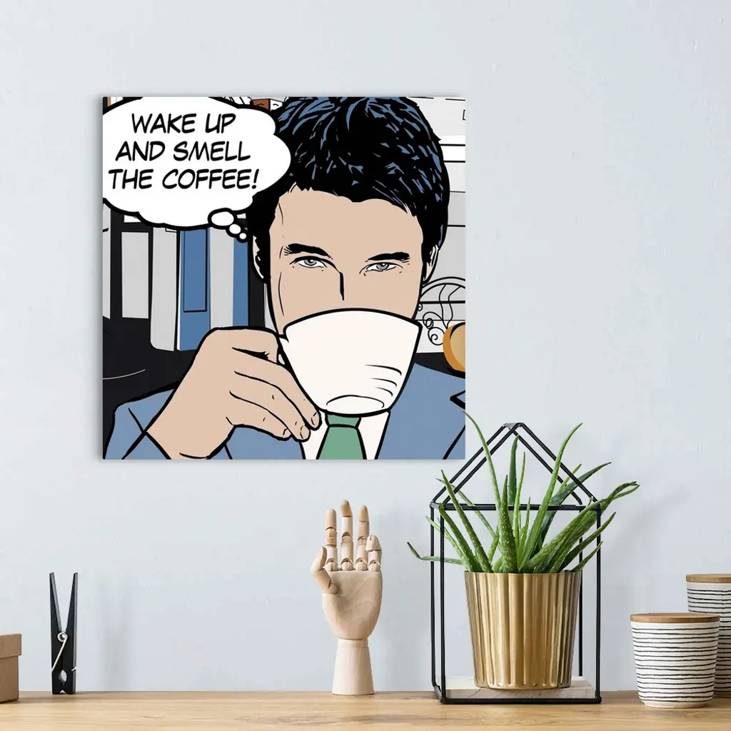 Pop art style decor artwork of a man drinking coffee with a thought bubble coming from his head.