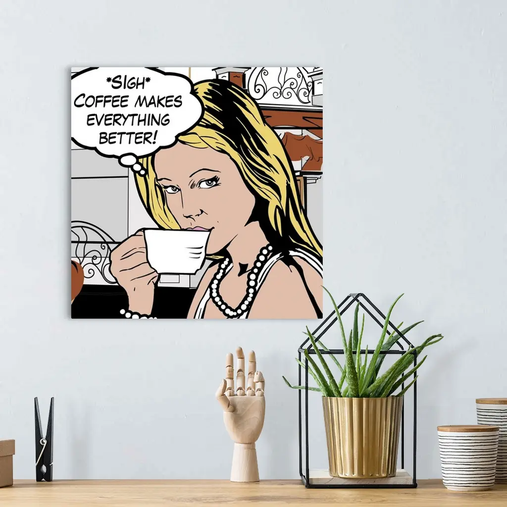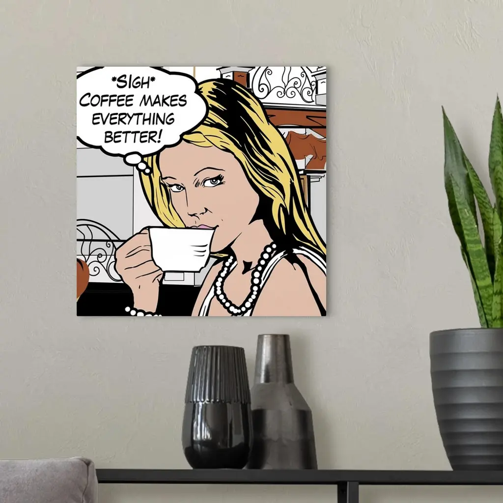 Pop art style decor artwork of a woman drinking coffee with a thought bubble coming from her head.