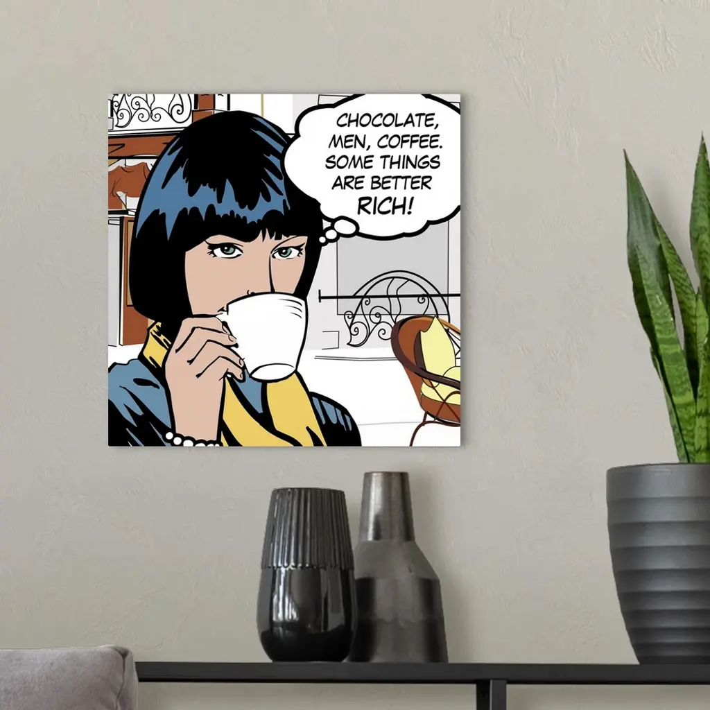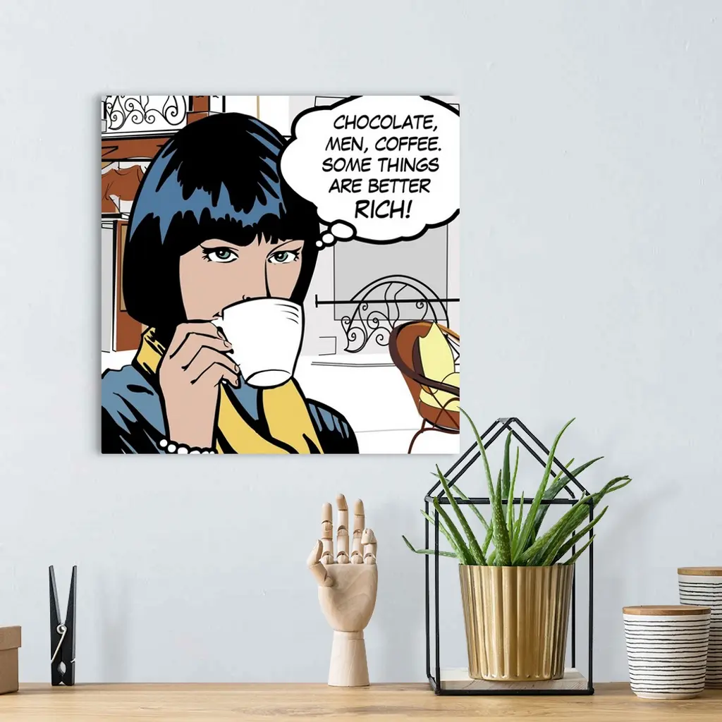 Pop art style decor artwork of a woman drinking coffee with a thought bubble coming from her head.
