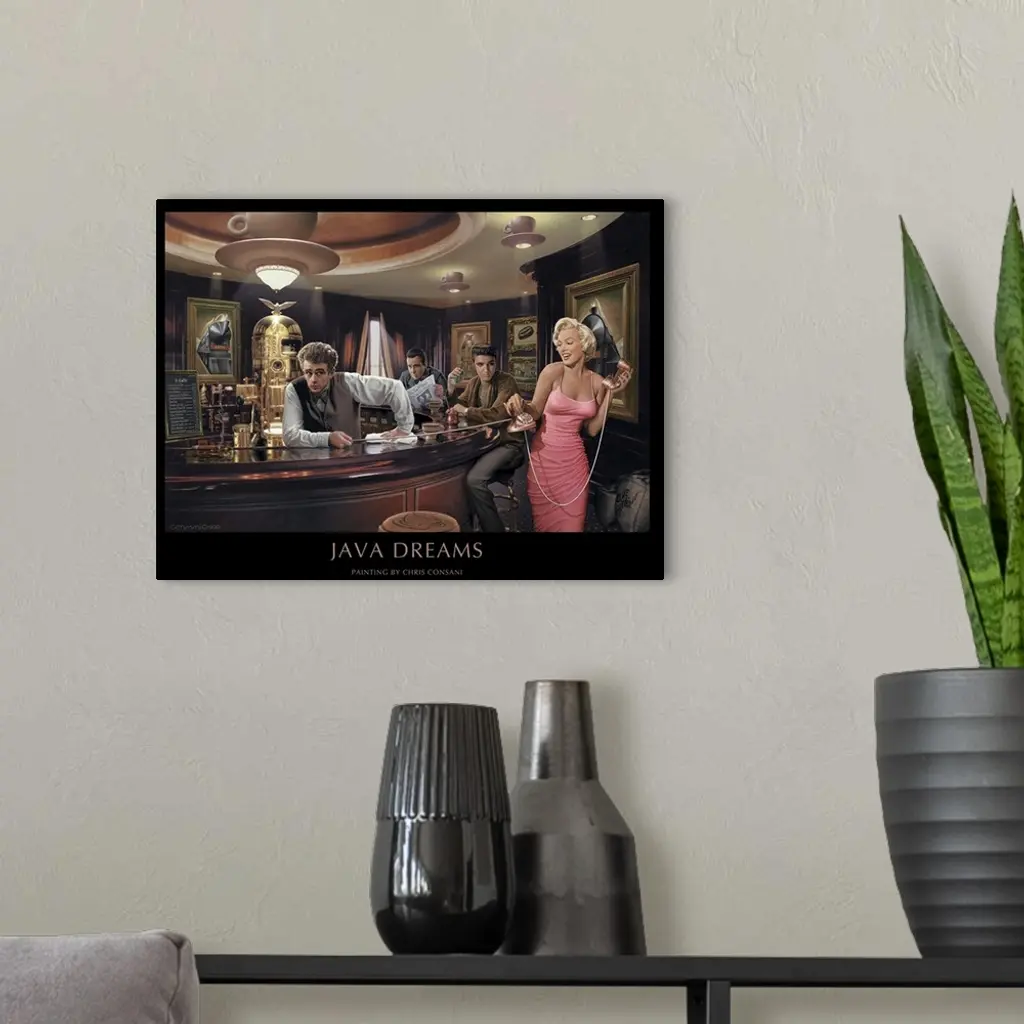 Painting of Marilyn Monroe in a coffee shop with James Dean as a barista.