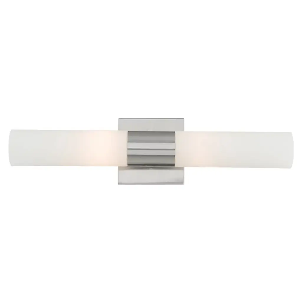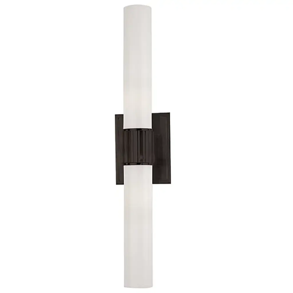 The Jayna Vanity Light from Alder & Ore features a symmetrical composition where hand-blown satin opal glass extensions project above and below a central brass collar. This approach to vanity lighting prioritizes balanced illumination by positioning light sources at two points rather than concentrating them in a single shade. The square steel backplate anchors the cylindrical ring that holds the glass tubes, each houses a candelabra bulb. The piece mounts vertically or horizontally, while the twist-lock glass system allows for easy maintenance. The brass accent adds warmth against the white opal diffusers.