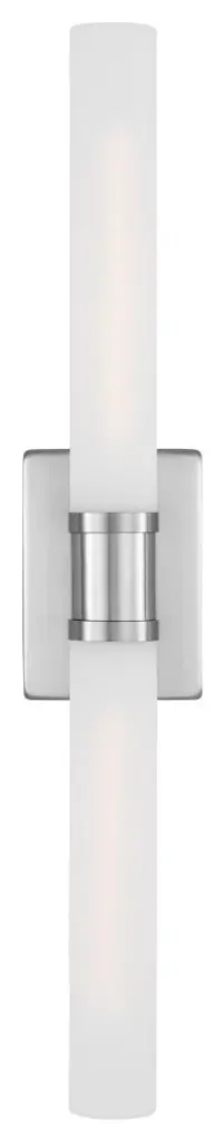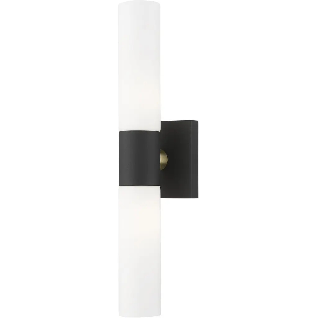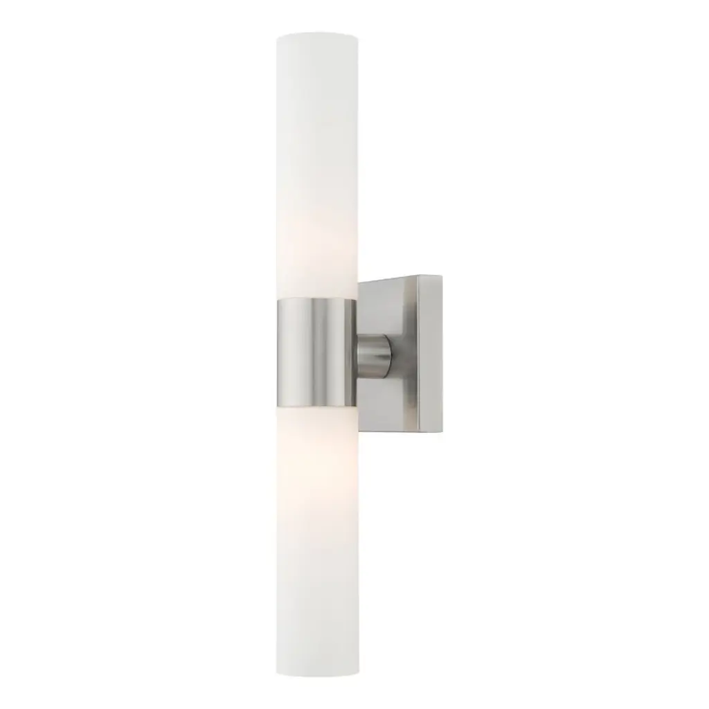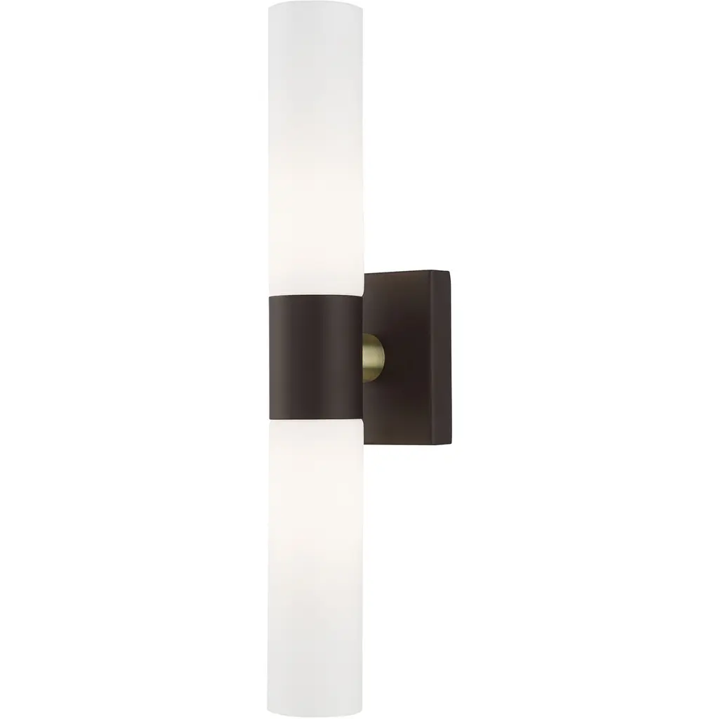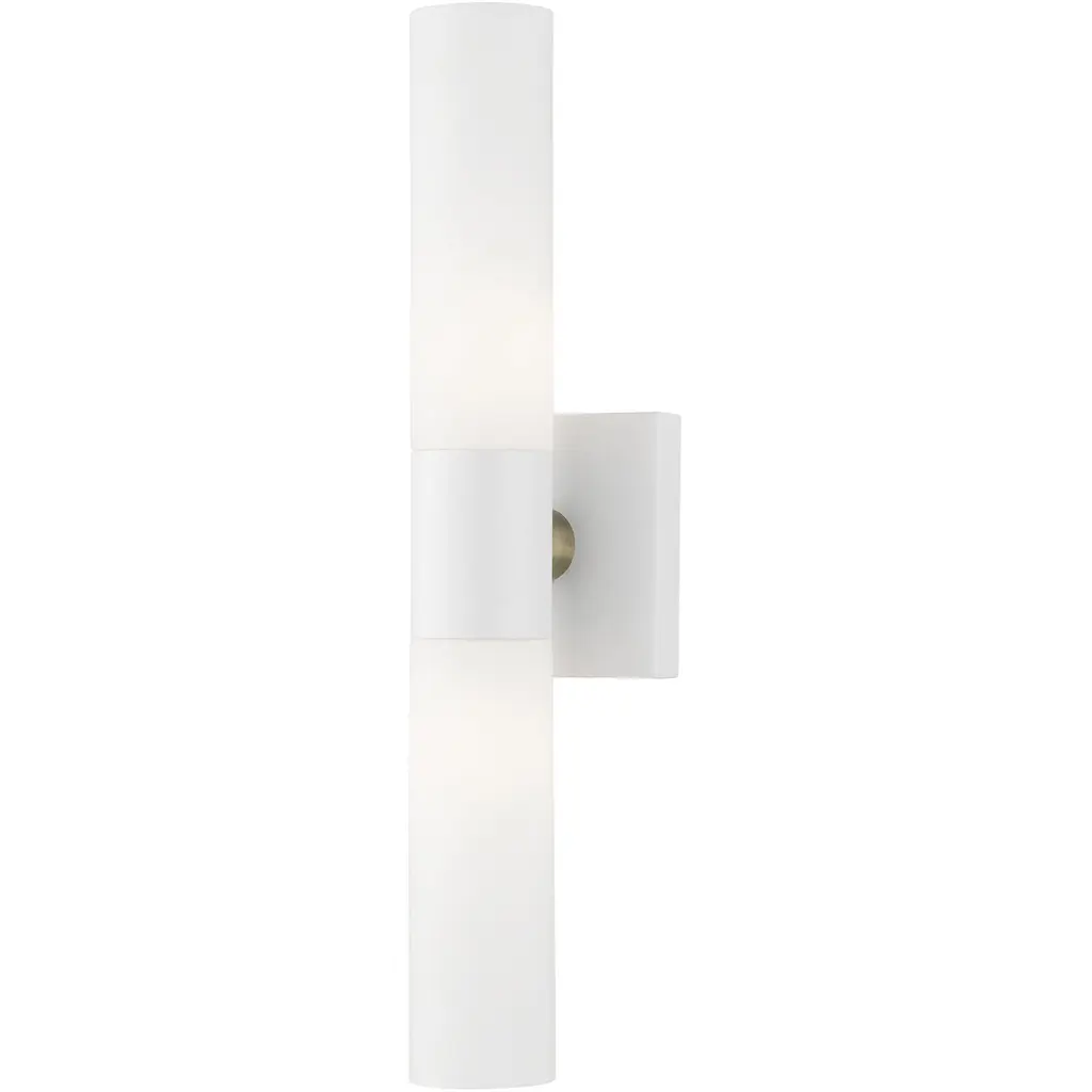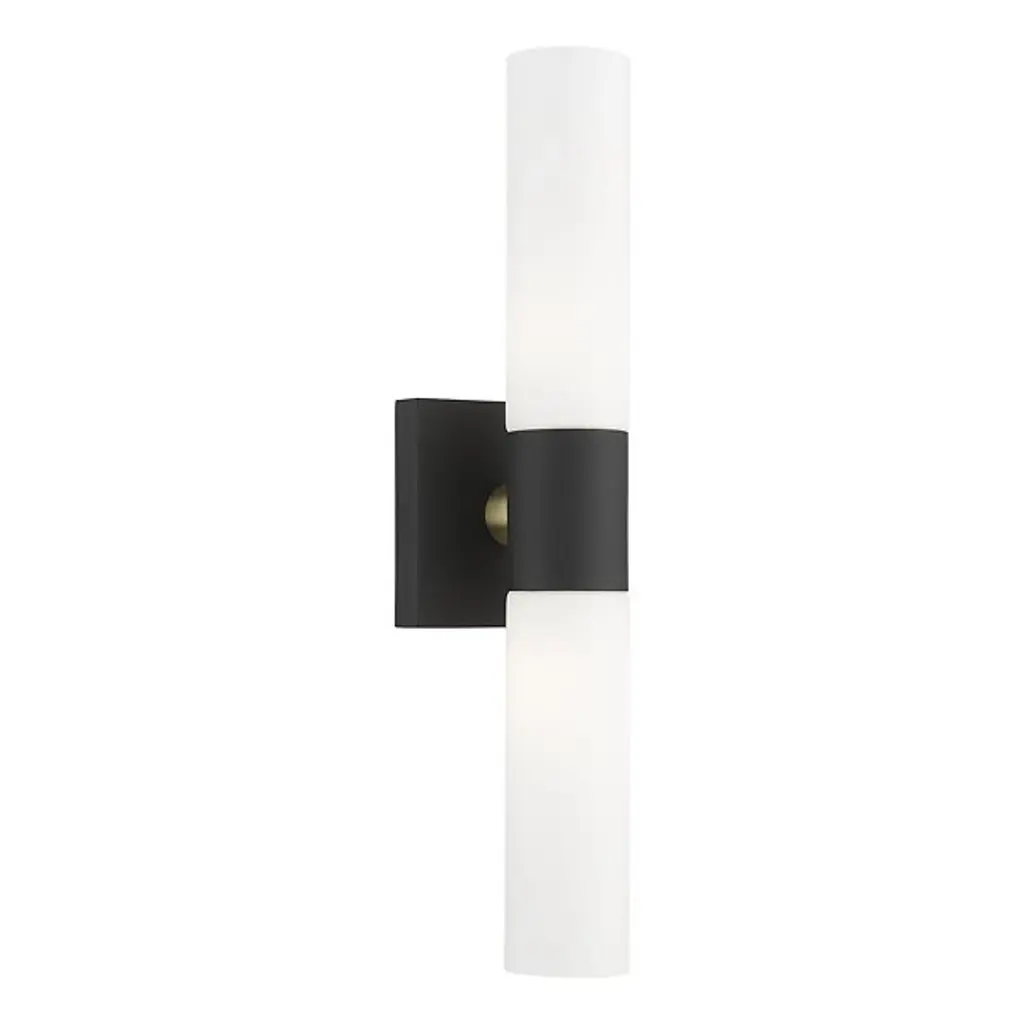 The Jayna Vanity Light from Alder & Ore features a symmetrical composition where hand-blown satin opal glass extensions project above and below a central brass collar. This approach to vanity lighting prioritizes balanced illumination by positioning light sources at two points rather than concentrating them in a single shade. The square steel backplate anchors the cylindrical ring that holds the glass tubes, each houses a candelabra bulb. The piece mounts vertically or horizontally, while the twist-lock glass system allows for easy maintenance. The brass accent adds warmth against the white opal diffusers.