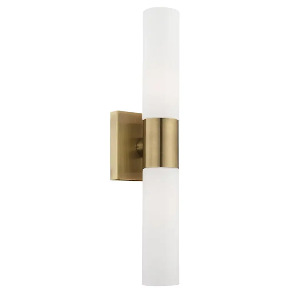 The Jayna Vanity Light from Alder & Ore features a symmetrical composition where hand-blown satin opal glass extensions project above and below a central brass collar. This approach to vanity lighting prioritizes balanced illumination by positioning light sources at two points rather than concentrating them in a single shade. The square steel backplate anchors the cylindrical ring that holds the glass tubes, each houses a candelabra bulb. The piece mounts vertically or horizontally, while the twist-lock glass system allows for easy maintenance. The brass accent adds warmth against the white opal diffusers.