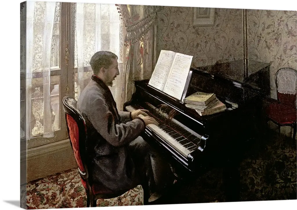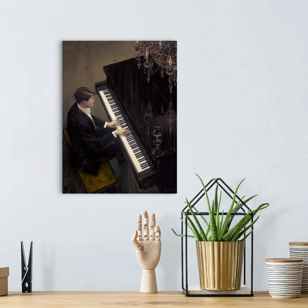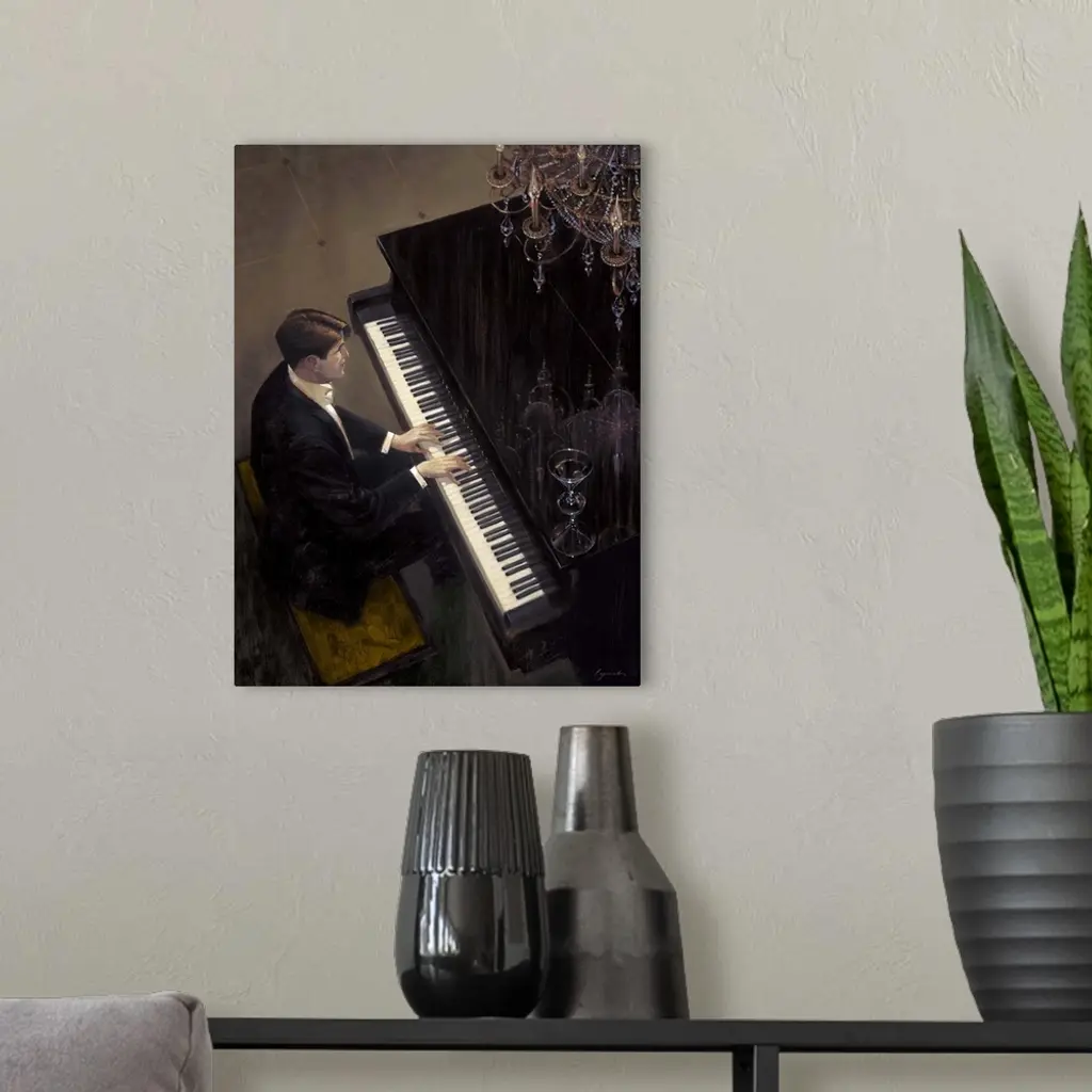 Contemporary painting of a man playing a piano, with chandelier over head.