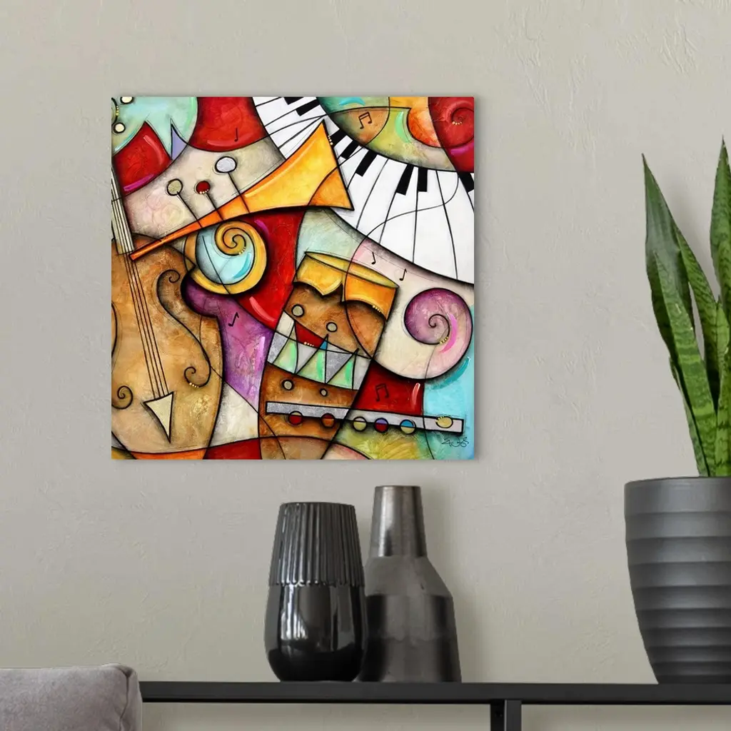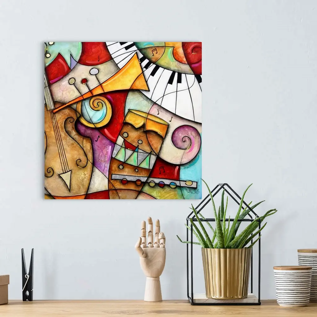 Musical instruments that have been elongated and abstracted into a contemporary painting on a square shaped canvas.