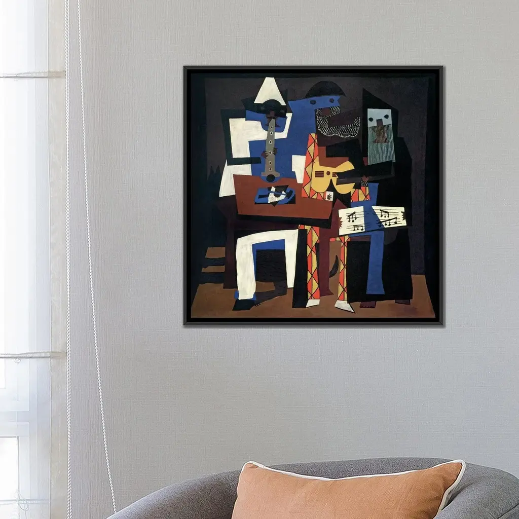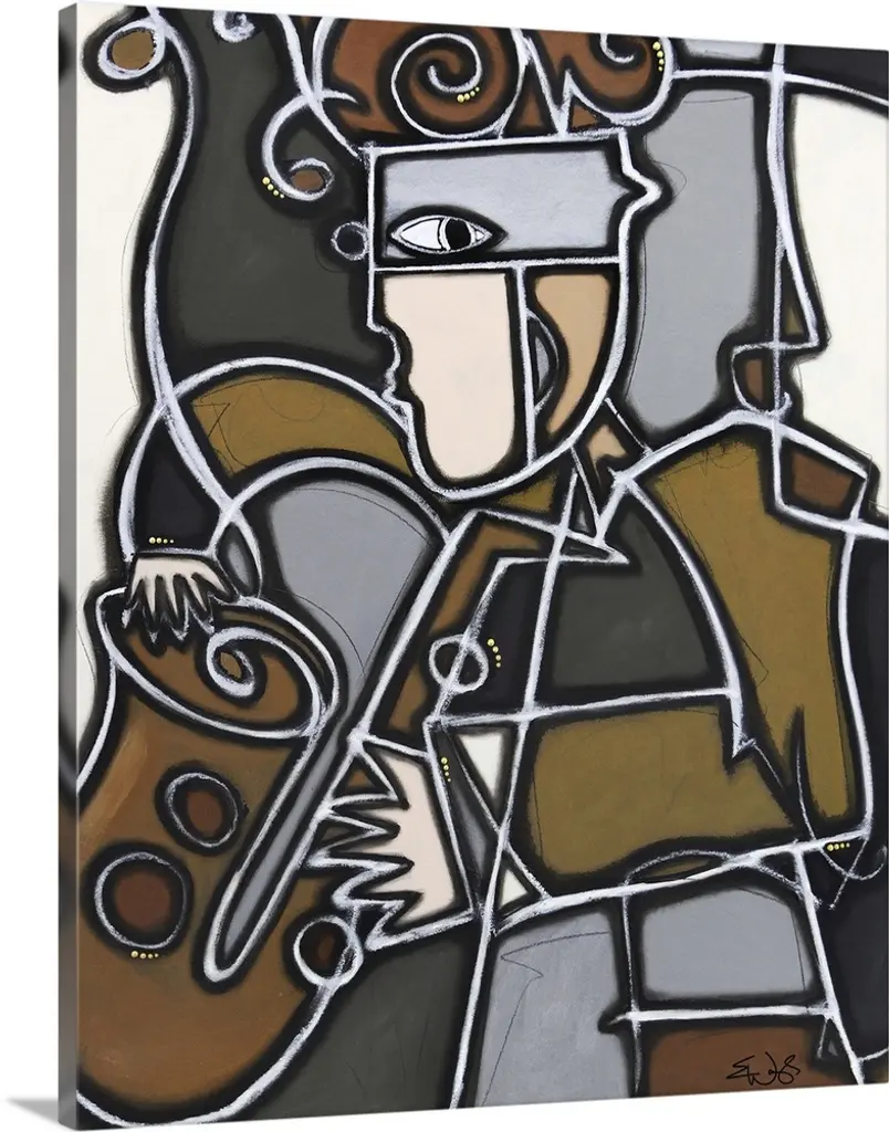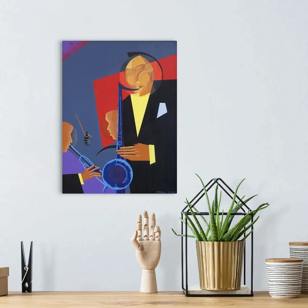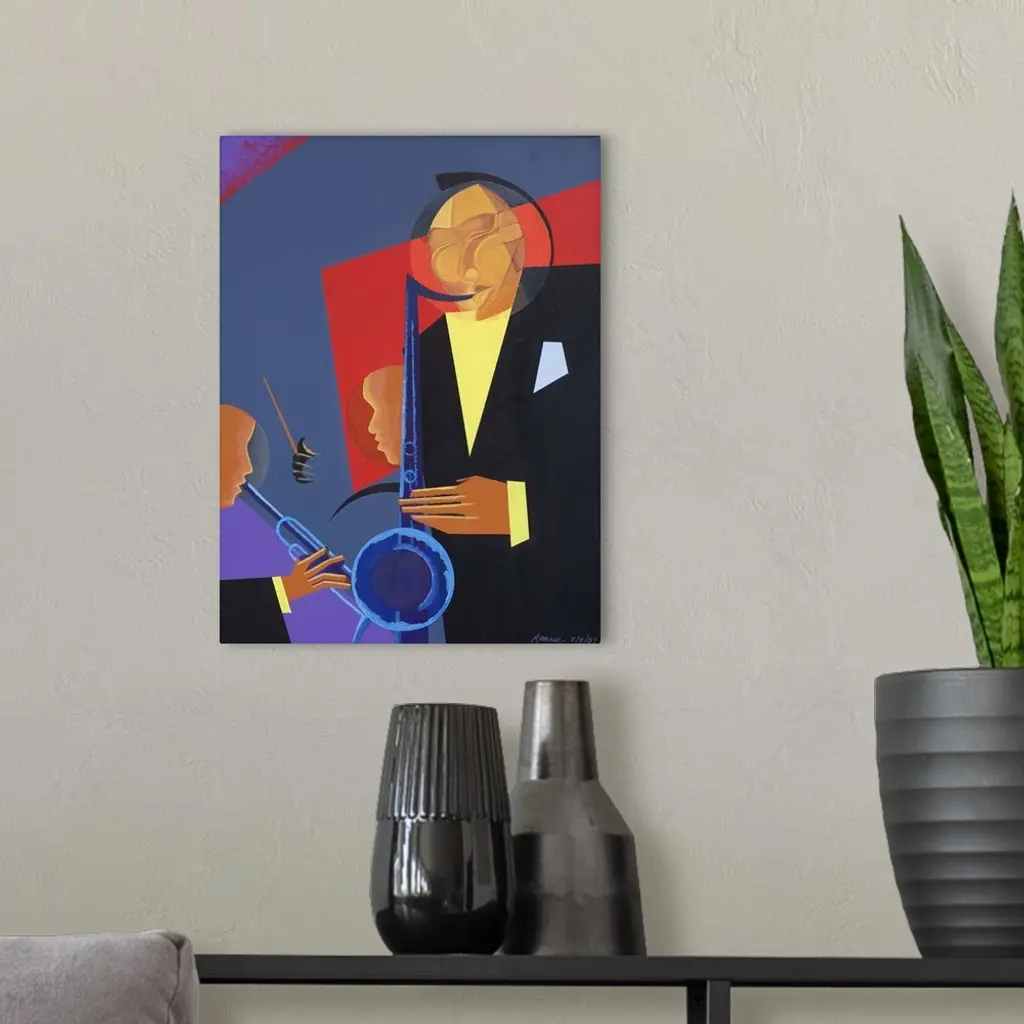 Abstract painting with oil of a guy on the right playing the saxophone and a guy on the left playing the trumpet.