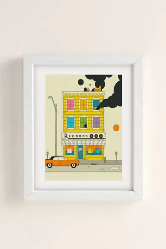 Art print by Jazzberry Blue featuring a retro record store. Printed on archival paper made from cotton pressed in Italian mills, this high-quality art print is available in sizes and frames just right for your space. First select your frame (or go frameless), then select your size. **About the Frames** \- The exact width of each frame may vary slightly \- All frames are manufactured in the US \- Matte frames are durable poly \- Wood frames are recycled wood \- All are fitted with protective plexiglass \- Finished with wood moldings, archival backer and protective bumpers **Size** \- Available in multiple sizes \- Use the Size Guides to find the size that fits your space **Content + Care** \- Wipe clean \- Made in the USA