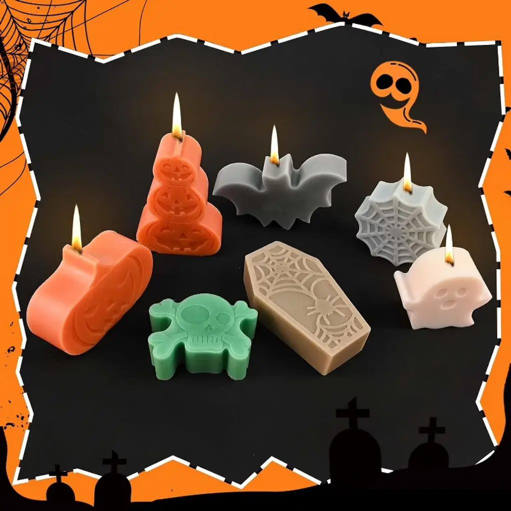 Jdiction 7 Pack Halloween Candle Molds: Skull, Spider Web, Pumpkin, Ghosts, Bat, Coffin - Fits Candles, Wax, Soap, Clay, Resin