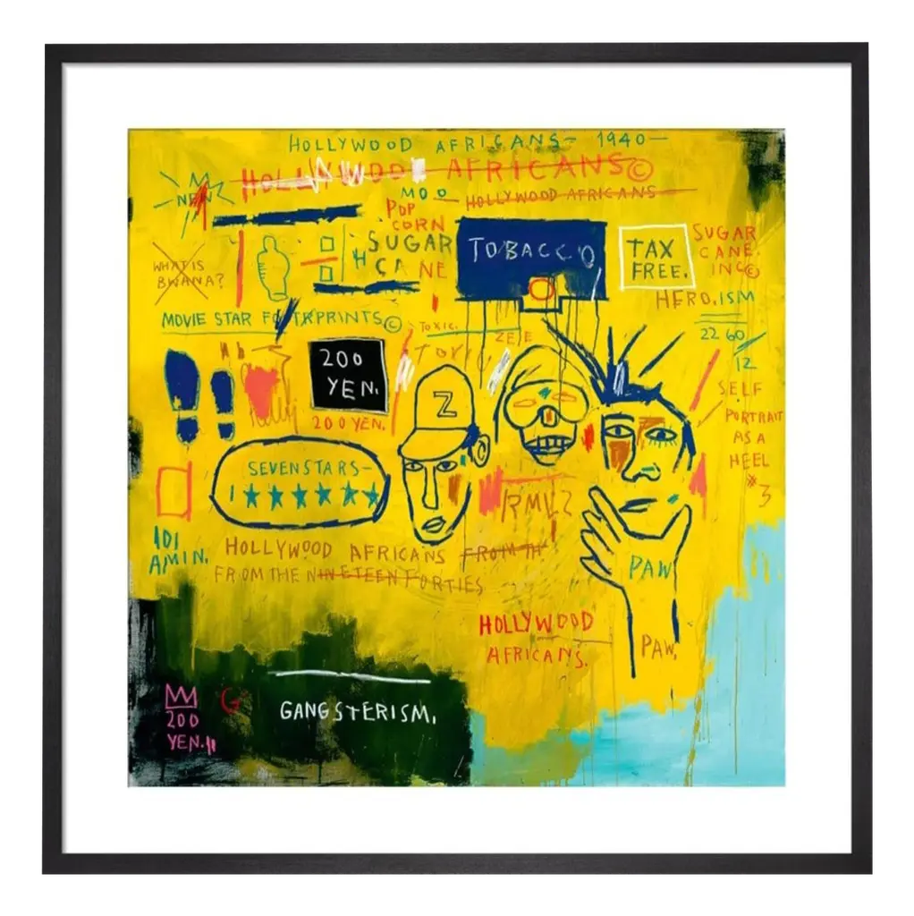 Jean-Michel Basquiat, Hollywood Africans, 1983/2021 Monte Carlo 300gsm watercolour paper framed in a sustainably sourced black ash with acrylic glaze. Image size 50 x 50 cm (19.68 x 19.68 in) Framed size 62 x 62 cm (24.40 x 24.40 in) Frame included you can choose with or without mount Jean-Michel Basquiat produced 'Hollywood Africans' whilst on an extended trip to Los Angeles. Basquiat covered the vibrant canvas with important motifs which challenged the inaccurate representation of African Americans within the film industry. For example, the phrase 'Hollywood Africans from the nineteen forties' alludes to the year that actress Hattie McDaniel became the first African American to win an Oscar for playing the racial caricature 'mammy' in 'Gone with The Wind'.
