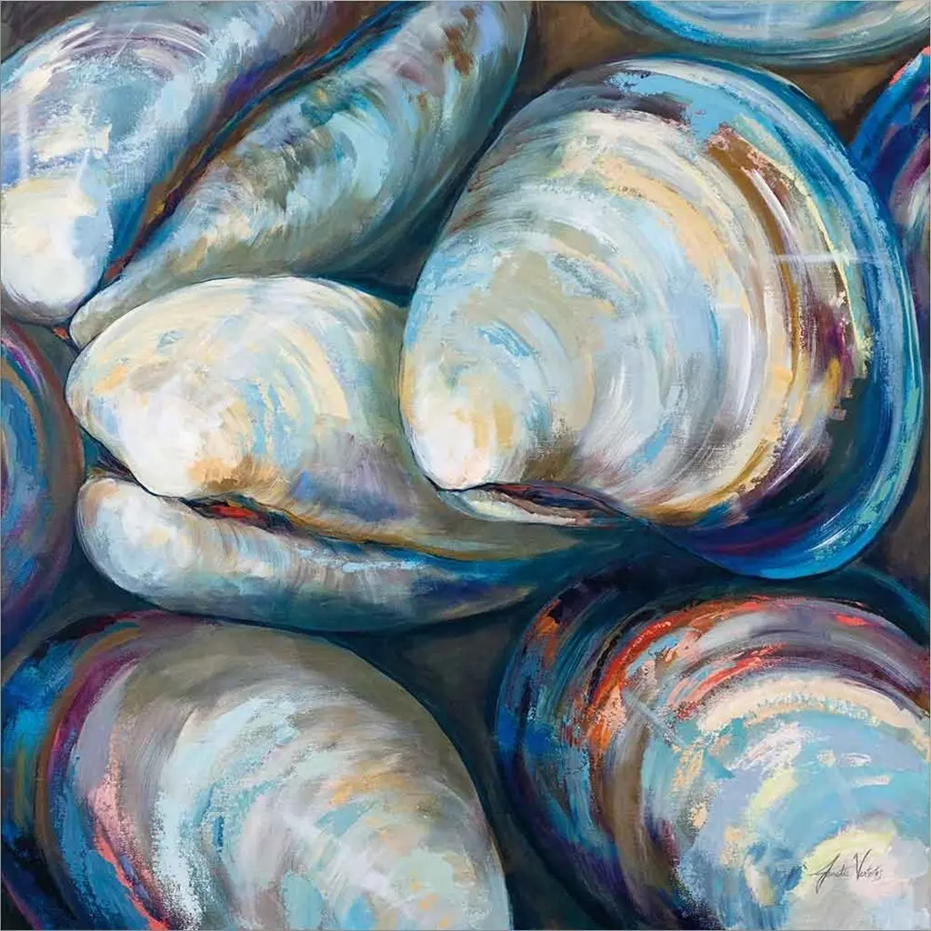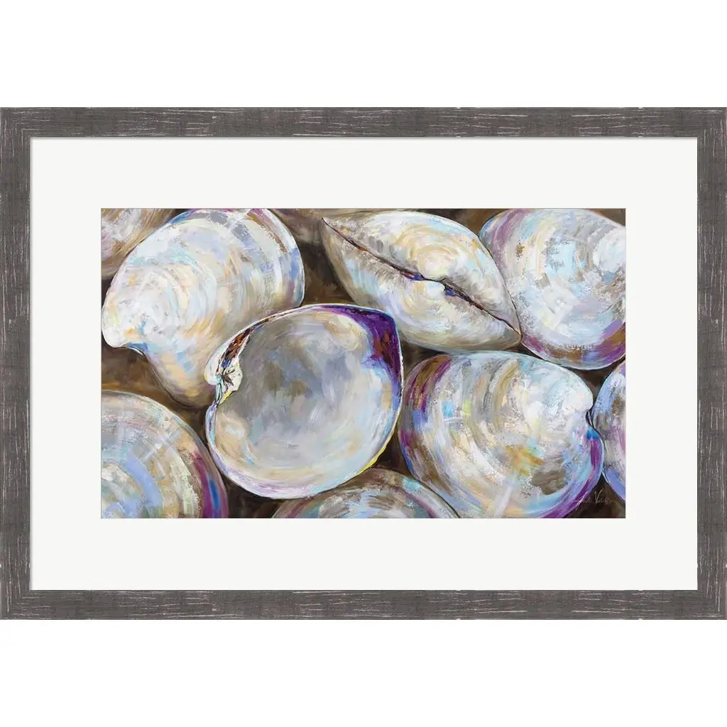 Clambake Cluster by Jeanette Vertentes is a high quality piece of framed artwork. The finished size of this piece is 24.5" X 17.25". It has a Rustic Grey Distressed frame, is single matted and finished with high quality Acrylic Plexiglass. 100% Satisfaction Guaranteed.