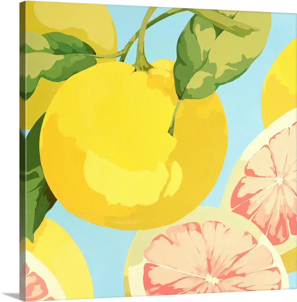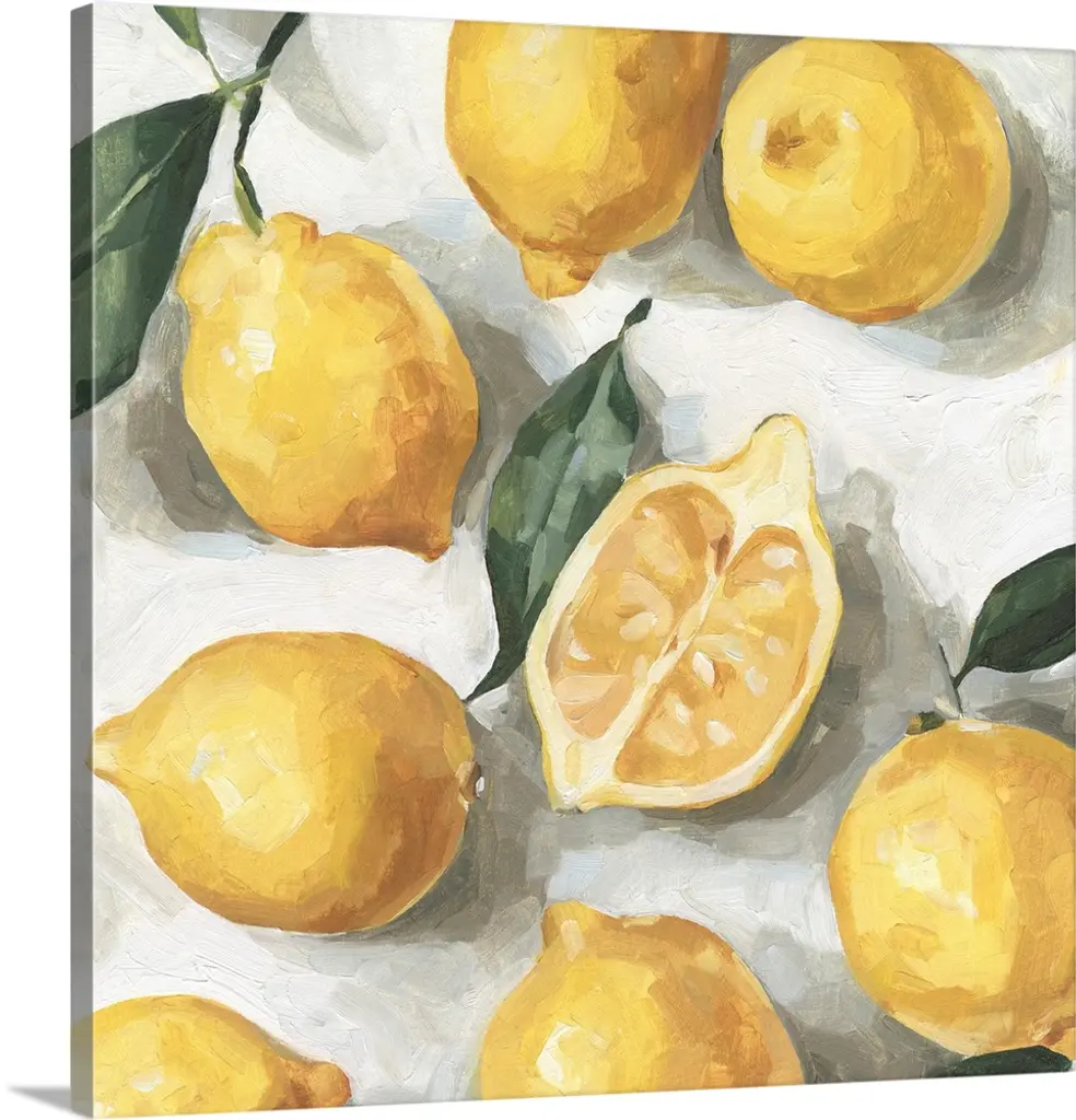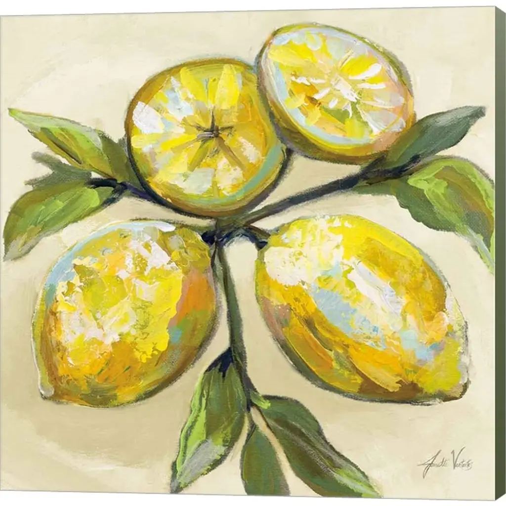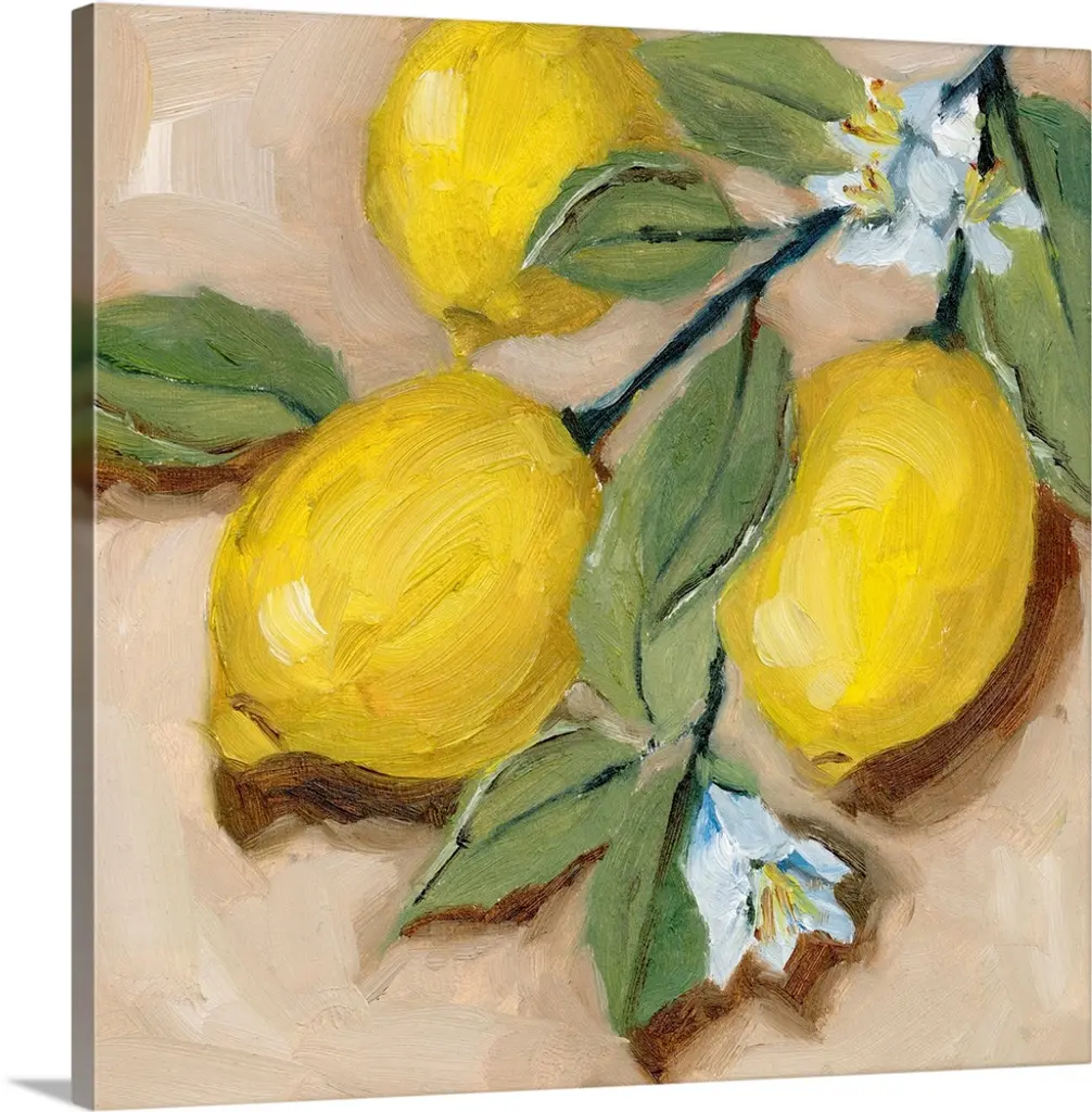 Lemons on Cream by Jeanette Vertentes is a high quality piece of canvas artwork. The finished size of this piece is 12" X 12", and it has a depth 1.5" with sagegreen painted sides. There is a UV protective coating over the entire image, and it is ready to hang on your wall with no hardware required. 100% Satisfaction Guaranteed.