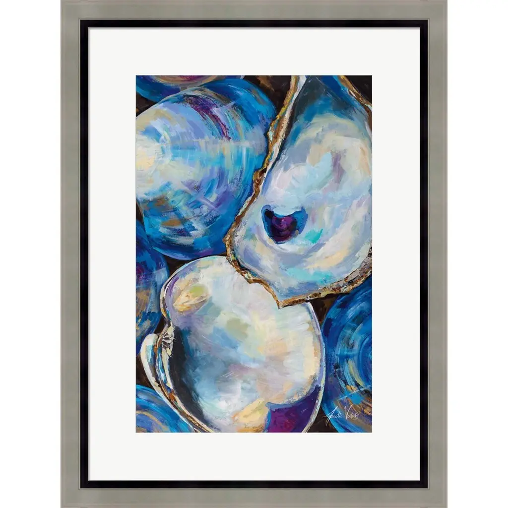 Matunuck Shells by Jeanette Vertentes is a high quality piece of framed artwork. The finished size of this piece is 19" X 25". It has a Contemporary Silver Wood w/Black Inner Accent frame, is single matted and finished with high quality Acrylic Plexiglass. 100% Satisfaction Guaranteed.