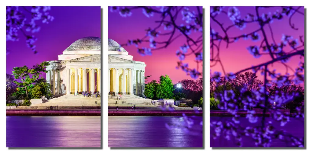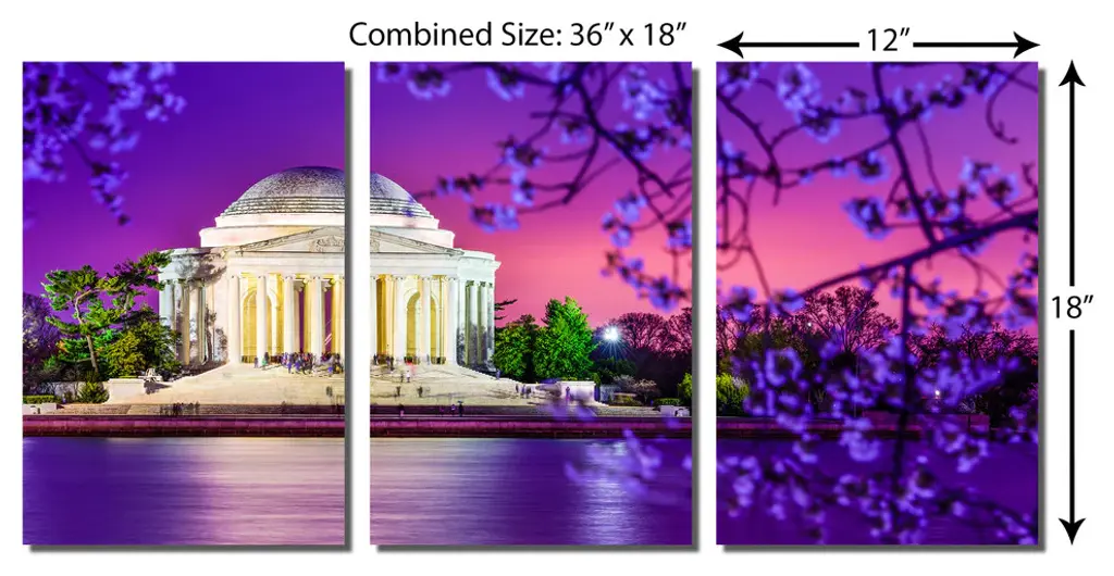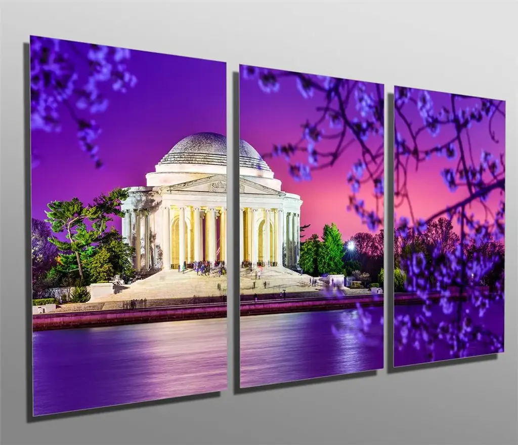 36"œ x 18"œ total size. Ready To Hang! (3 pieces - 12"œ x 18"œ each). 3 Panel Split (Triptych) Metal Print featuring the Jefferson memorial in Washington DC. Modern metal wall art for home or office wall decor & interior design. Printed on Luxurious, HD aluminum glossy metal panels. Multi panel art.. HD aluminum panels. Metal print wall art. Includes Shadow Wall Mount on the back.• Aluminum Metal Wall Art• Made in USA• Ready to hang - No assembly required• Shadow mount hardware on the back• 0.045"œ thick HD Aluminum Panels• Scratch resistant, glossy finish• Superb color clarity, luxurious prints• Epson printing process• For indoor or moisture rich environment use• Easy to clean. Gently wipe with microfiber cloth.