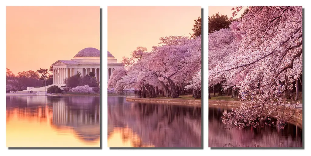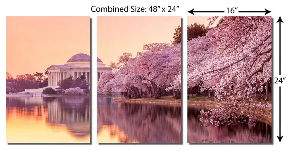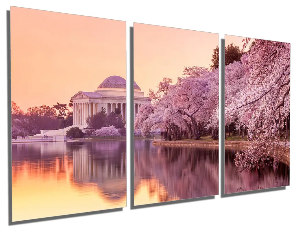 48"œ x 24"œ total size. Ready To Hang! (3 pieces - 16"œ x 24"œ each). 3 Panel Split (Triptych) Metal Print ft. Jefferson Memorial during cherry blossom festival. Modern metal wall art for home or office wall decor & interior design. Printed on Luxurious, HD aluminum glossy metal panels. Multi panel art.. HD aluminum panels. Metal print wall art. Includes Shadow Wall Mount on the back.• Aluminum Metal Wall Art• Made in USA• Ready to hang - No assembly required• Shadow mount hardware on the back• 0.045"œ thick HD Aluminum Panels• Scratch resistant, glossy finish• Superb color clarity, luxurious prints• Epson printing process• For indoor or moisture rich environment use• Easy to clean. Gently wipe with microfiber cloth.