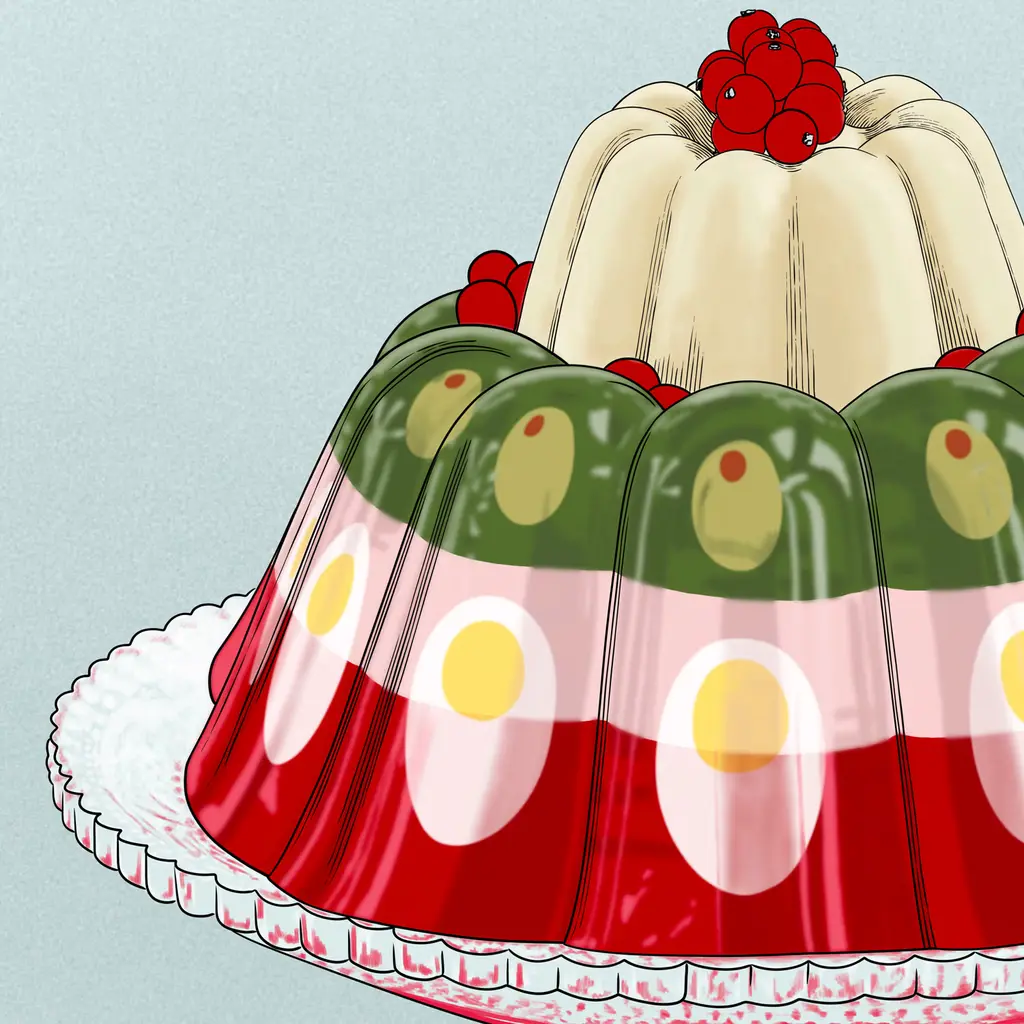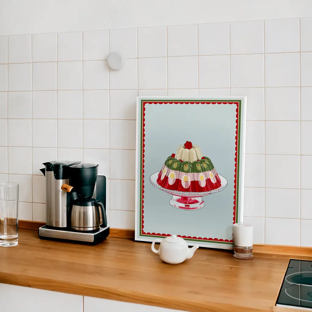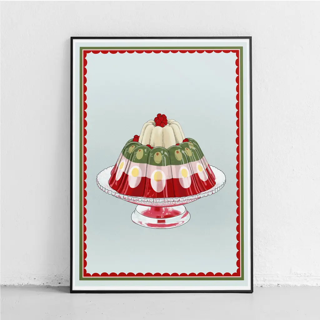 Signed Giclee fine art print illustrated by Abi Overland.Based on the weird and wonderful jelly based recipes of the 1980’s dinner party scene.Bringing back the nostalgia of the gloriously disgusting meals, perfect kitsch colour pop for your kitchen, lounge or bar area.All prints come unframed