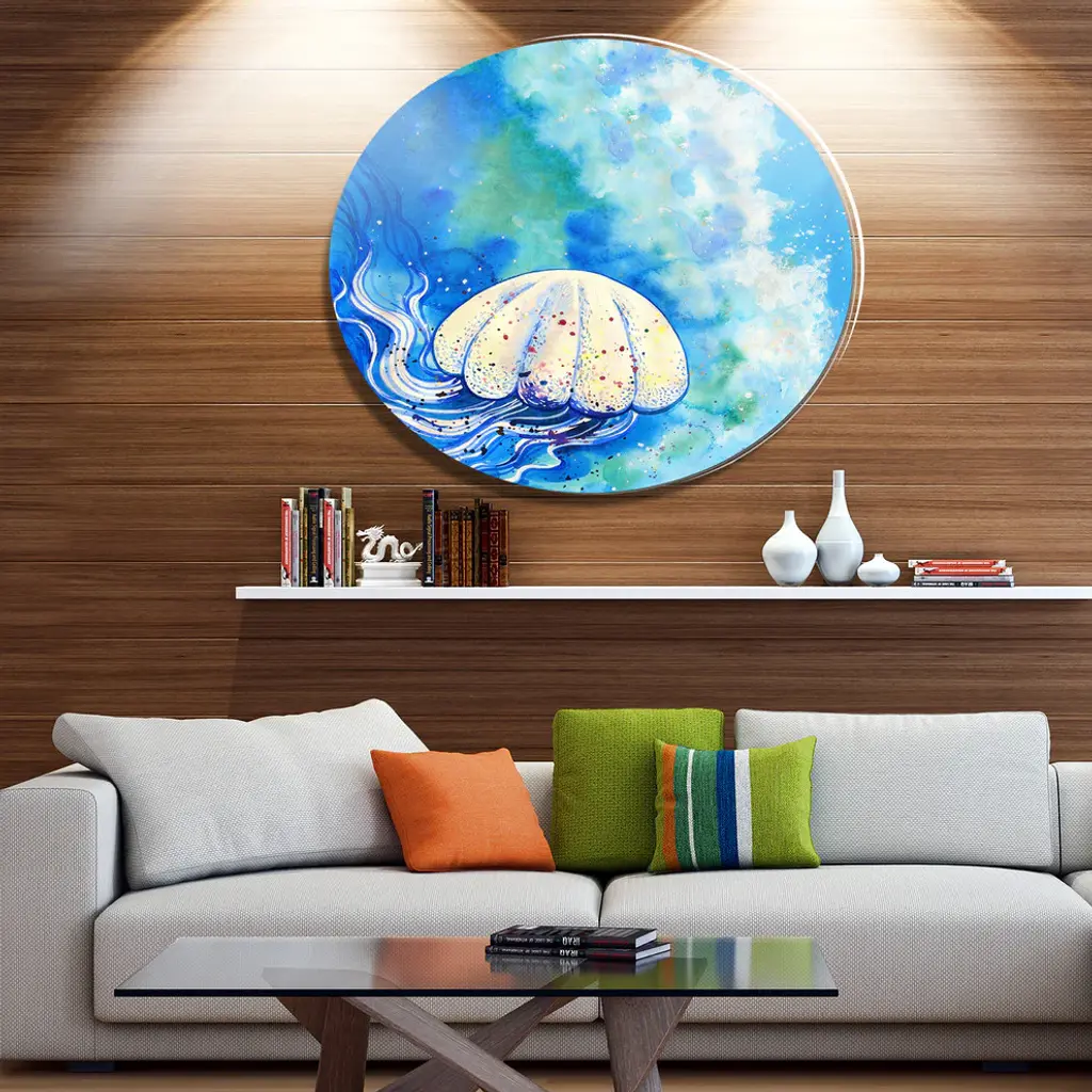 Bring Contemporary Abstraction to your home with this large Circle Metal wall art. This Large Jellyfish Watercolor Metal Artwork makes it the focal point of any room or office. - White Gloss Coating ensures colors are extra vibrant with light reflection.- Aluminum grade Sheet Metal with 1 inch mounting frame on the back giving the illusion that the artwork is floating on the wall..- Mounting Brackets are included along with instructions.- High Quality Digital images are created directly into a glossy aluminum panel producing a stunning and captivating print into the glossy finish of the metal.- Water, Fire and Scratch resistant HD Aluminum panels.- Looks better than any photo paper and guaranteed to last at least 20 years- Easy to clean with a microfiber cloth. Colors are far superior to regular Canvas Art. - Easy to Hang