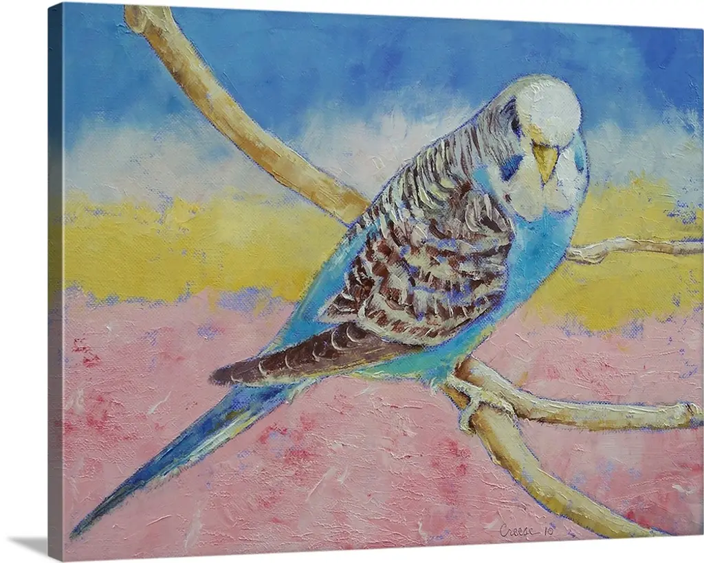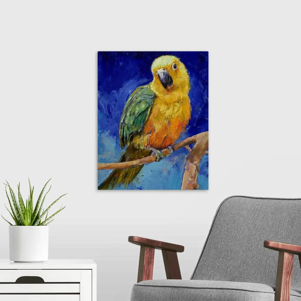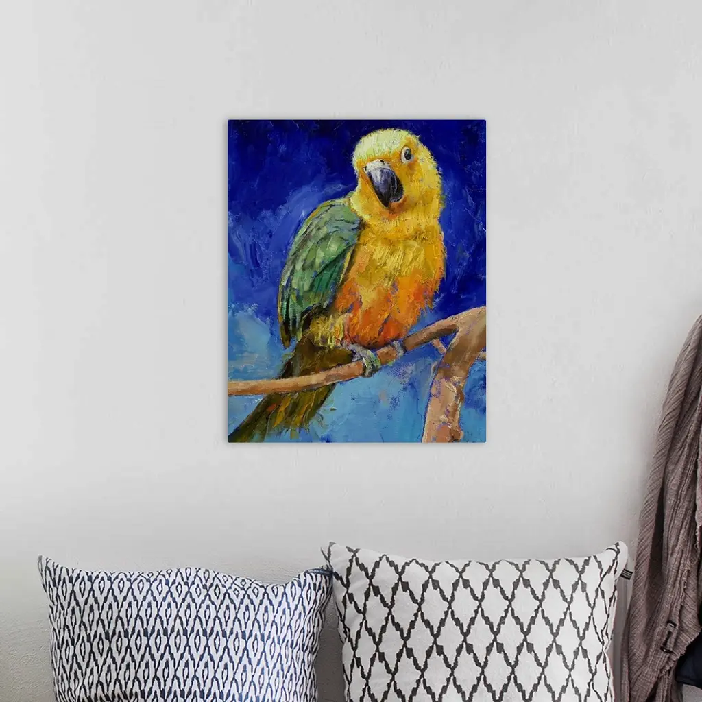 Vertical oil painting on a large wall hanging of a Jenday Conure bird, perched on a branch, against a bright blue background.