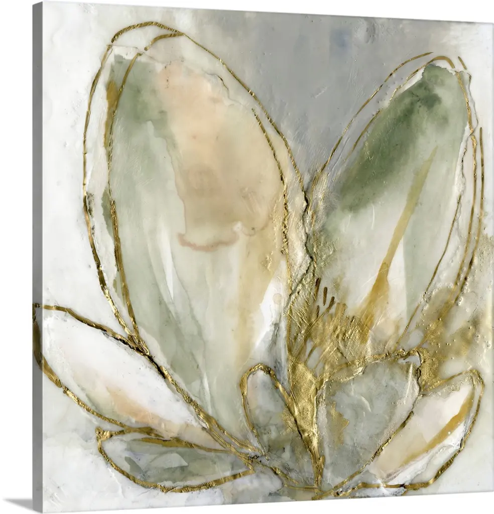 Blooming Gold I by Jennifer Goldberger is a high quality piece of canvas artwork. The finished size of this piece is 24" X 24", and it has a depth 1.5" with black painted sides. There is a UV protective coating over the entire image, and it is ready to hang on your wall with no hardware required.