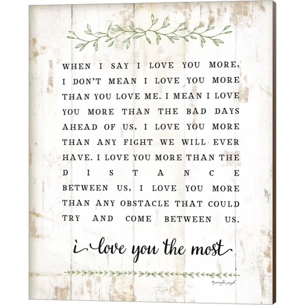 I Love You More by Jennifer Pugh is a high quality piece of canvas artwork. The finished size of this piece is 16" X 20", and it has a depth 0.75" with nutmeg painted sides. There is a UV protective coating over the entire image, and it is ready to hang on your wall with no hardware required. 100% Satisfaction Guaranteed.