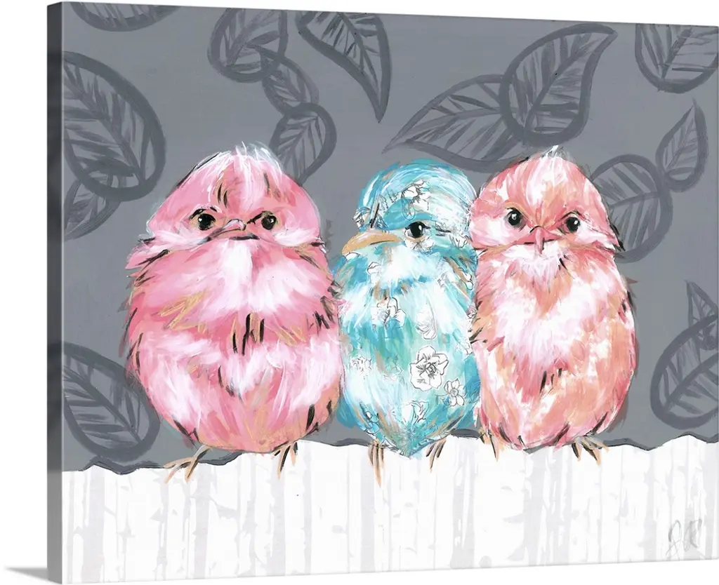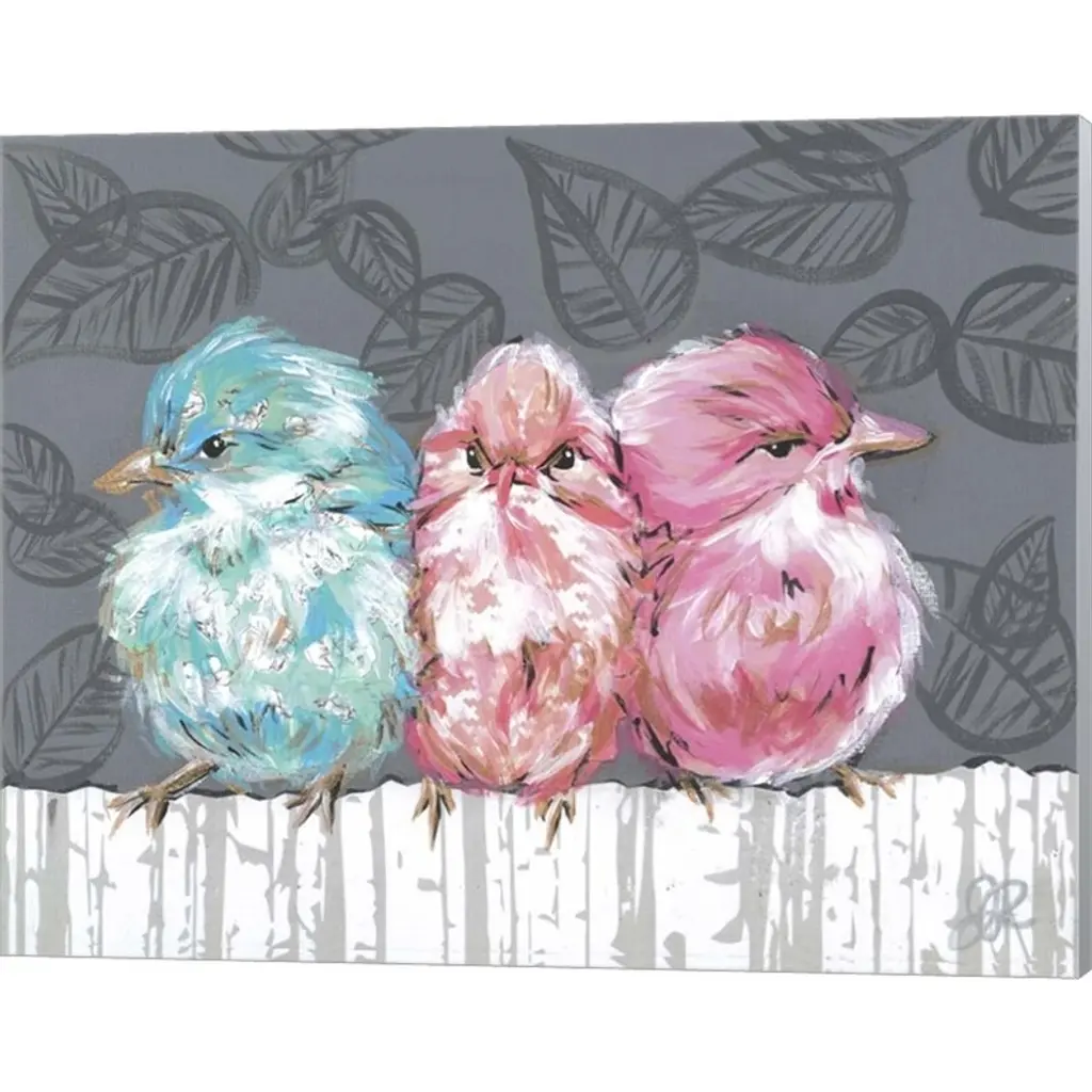 Bird Trio I by Jennifer Rutledge is a high quality piece of canvas artwork. The finished size of this piece is 20" X 16", and it has a depth 0.75" with wintergray painted sides. There is a UV protective coating over the entire image, and it is ready to hang on your wall with no hardware required.
