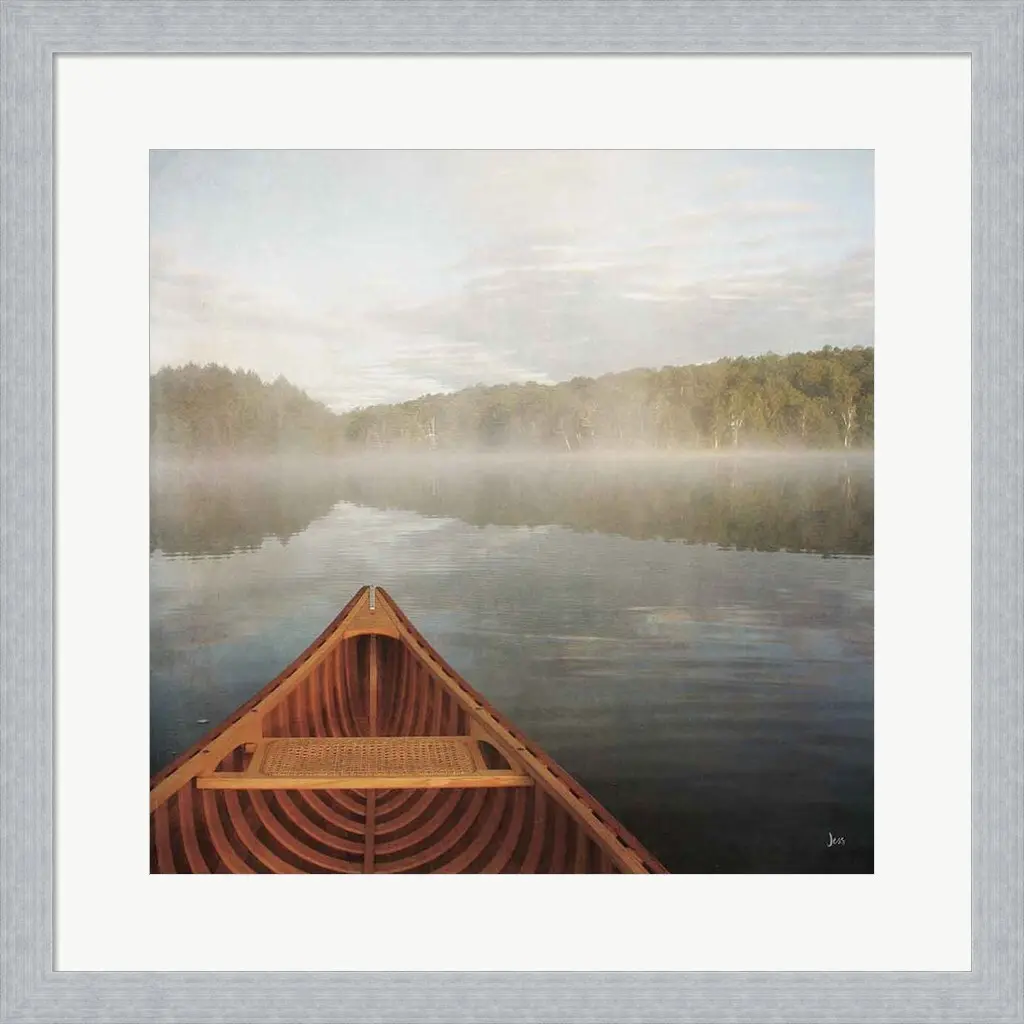 Calm Waters Canoe I by Jess Aiken is a high quality piece of framed artwork. The finished size of this piece is 19.5" X 19.5" with an image size of 14" X 14". It has a Slim Platinum Silver frame with a 2" white mat and is finished with high quality Glass. 100% Satisfaction Guaranteed.
