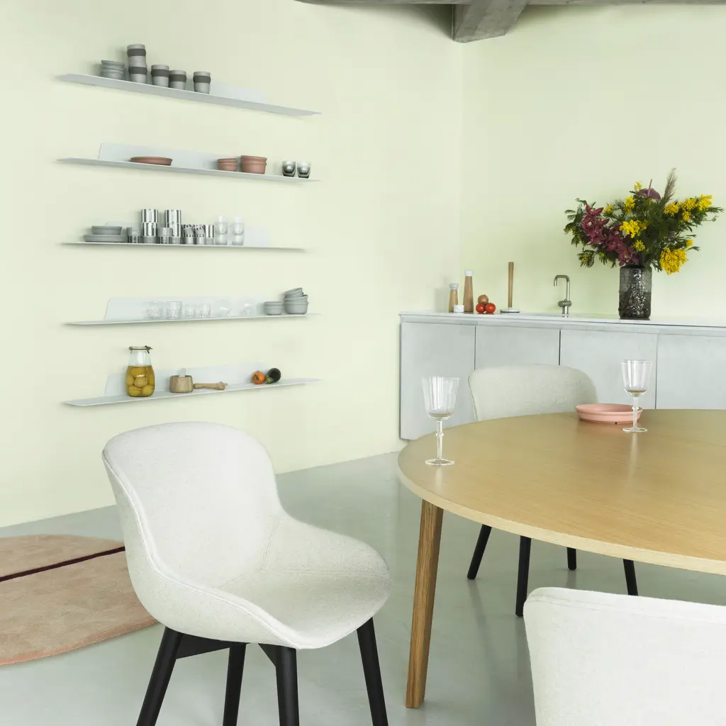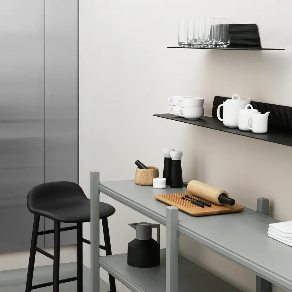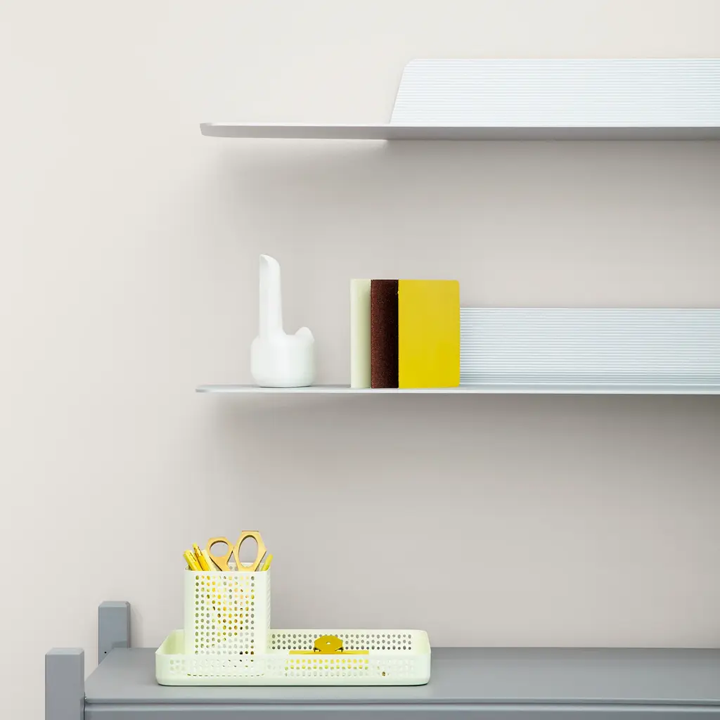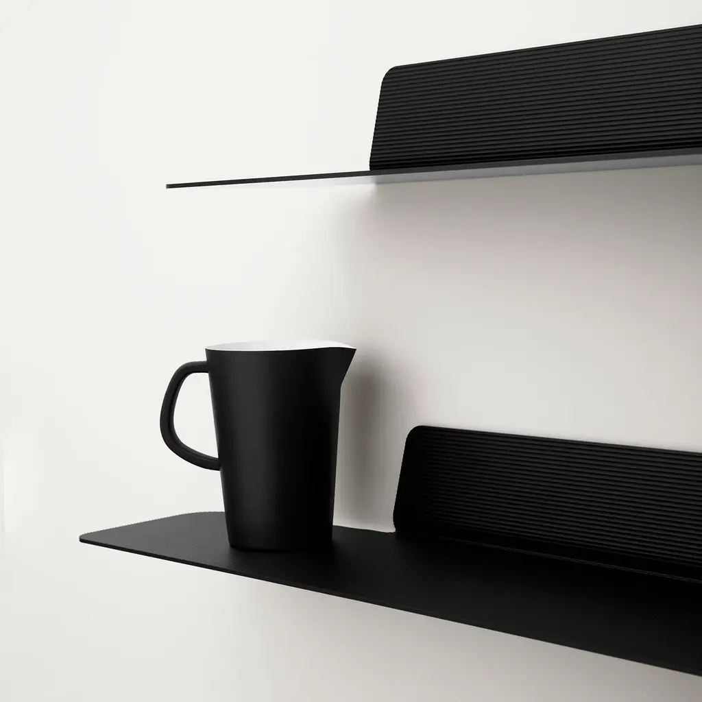 Aerodynamic design inspired the fittingly named Jet, a light aluminum wall shelf with a spacious surface and a unmistakably airborne silhouette. The grooved interior makes an attractive platform for storing workaday miscellany when mounted over a desk or for displaying artworks or treasured items in a living room or hallway. Jet's industrial contours get a luxe treatment in white and black powder-coated aluminum or in metallic silver and champagne with an anodized finish.