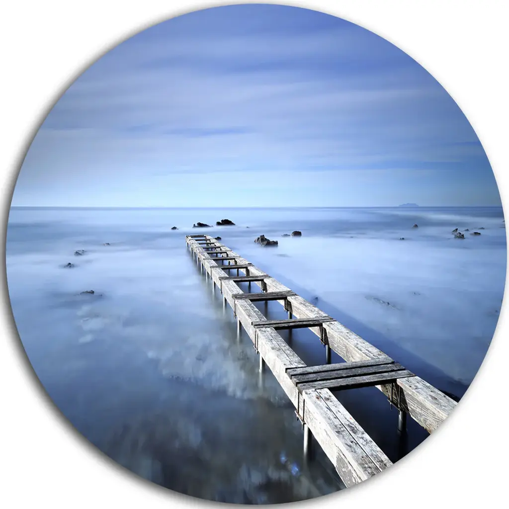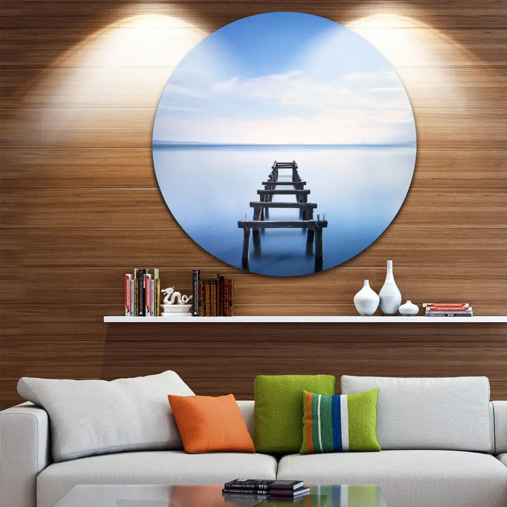 Jetty Remains In Blue Lake, Seascape Photo Round Metal Wall Art, 36"