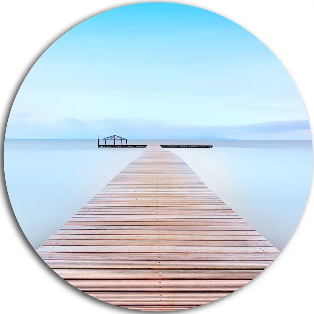 Bring Contemporary Abstraction to your home with this large Circle Metal wall art. This Jetty Remains in Blue Lake Metal Artwork makes it the focal point of any room or office. - White Gloss Coating ensures colors are extra vibrant with light reflection.- Aluminum grade Sheet Metal with 1 inch mounting frame on the back giving the illusion that the artwork is floating on the wall..- Mounting Brackets are included along with instructions.- High Quality Digital images are created directly into a glossy aluminum panel producing a stunning and captivating print into the glossy finish of the metal.- Water, Fire and Scratch resistant HD Aluminum panels.- Looks better than any photo paper and guaranteed to last at least 20 years- Easy to clean with a microfiber cloth. Colors are far superior to regular Canvas Art. - Easy to Hang