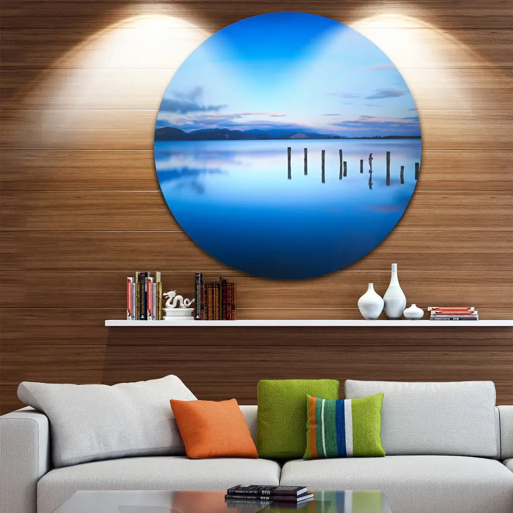 Bring Contemporary Abstraction to your home with this large Circle Metal wall art. This Jetty Remains in Blue Sea Metal Artwork makes it the focal point of any room or office. - White Gloss Coating ensures colors are extra vibrant with light reflection.- Aluminum grade Sheet Metal with 1 inch mounting frame on the back giving the illusion that the artwork is floating on the wall..- Mounting Brackets are included along with instructions.- High Quality Digital images are created directly into a glossy aluminum panel producing a stunning and captivating print into the glossy finish of the metal.- Water, Fire and Scratch resistant HD Aluminum panels.- Looks better than any photo paper and guaranteed to last at least 20 years- Easy to clean with a microfiber cloth. Colors are far superior to regular Canvas Art. - Easy to Hang