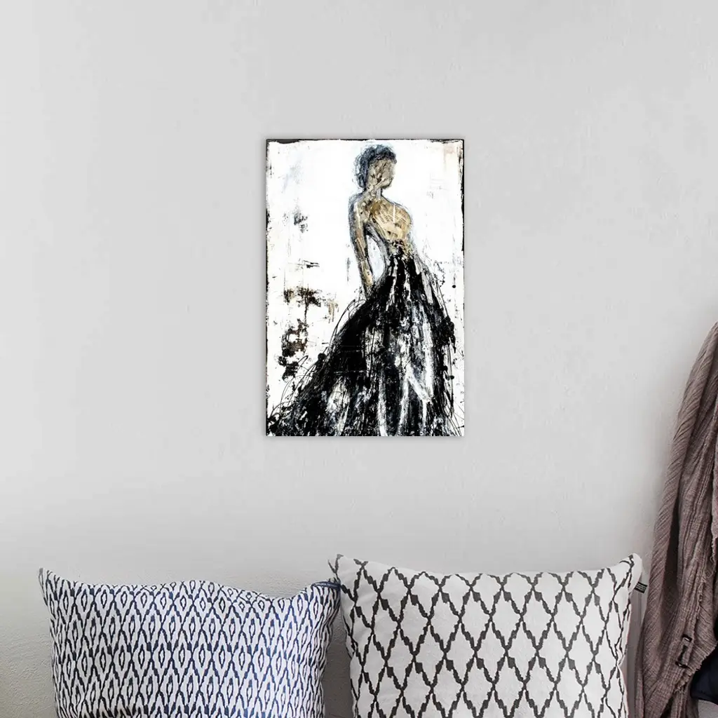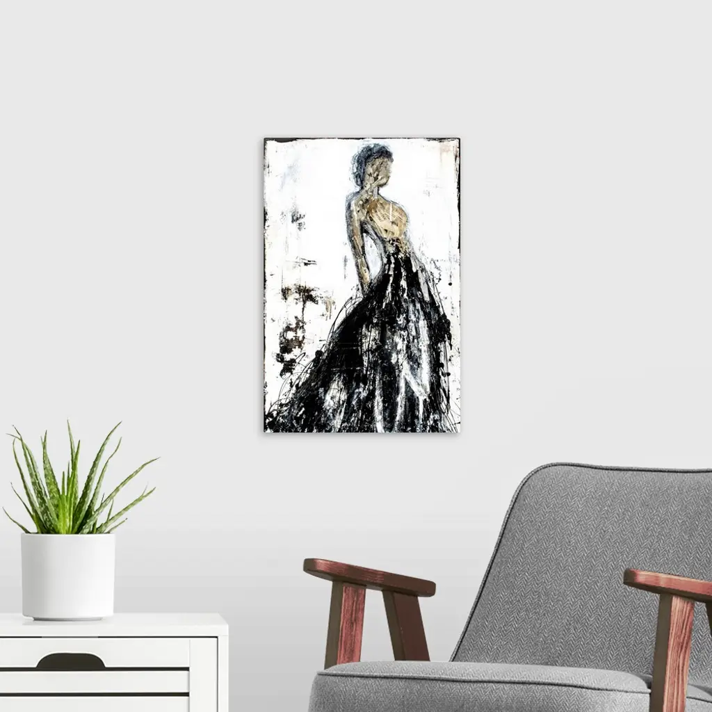 Abstract painting of a faceless woman in a long black gown with a tan body created with cut up pieces of paper, all on a distressed white background.