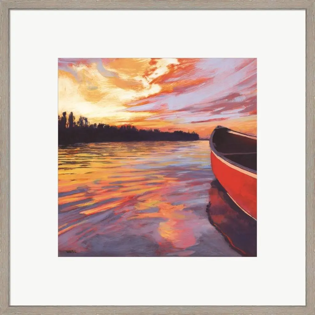 Red Canoe by Jim Musil is a high quality piece of framed artwork. The finished size of this piece is 25" X 25". It has a Distressed Aged White Wash frame, is single matted and finished with high quality Acrylic Plexiglass. 100% Satisfaction Guaranteed.