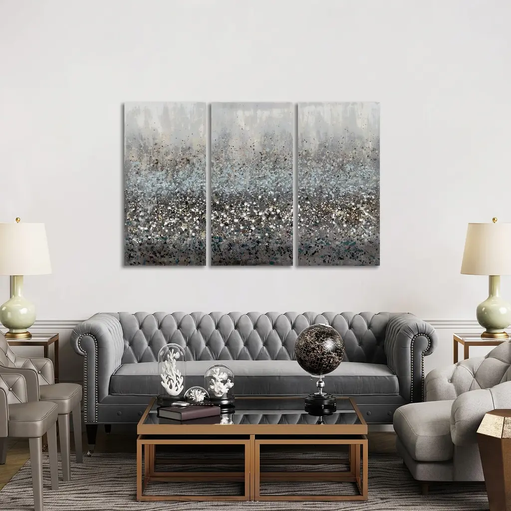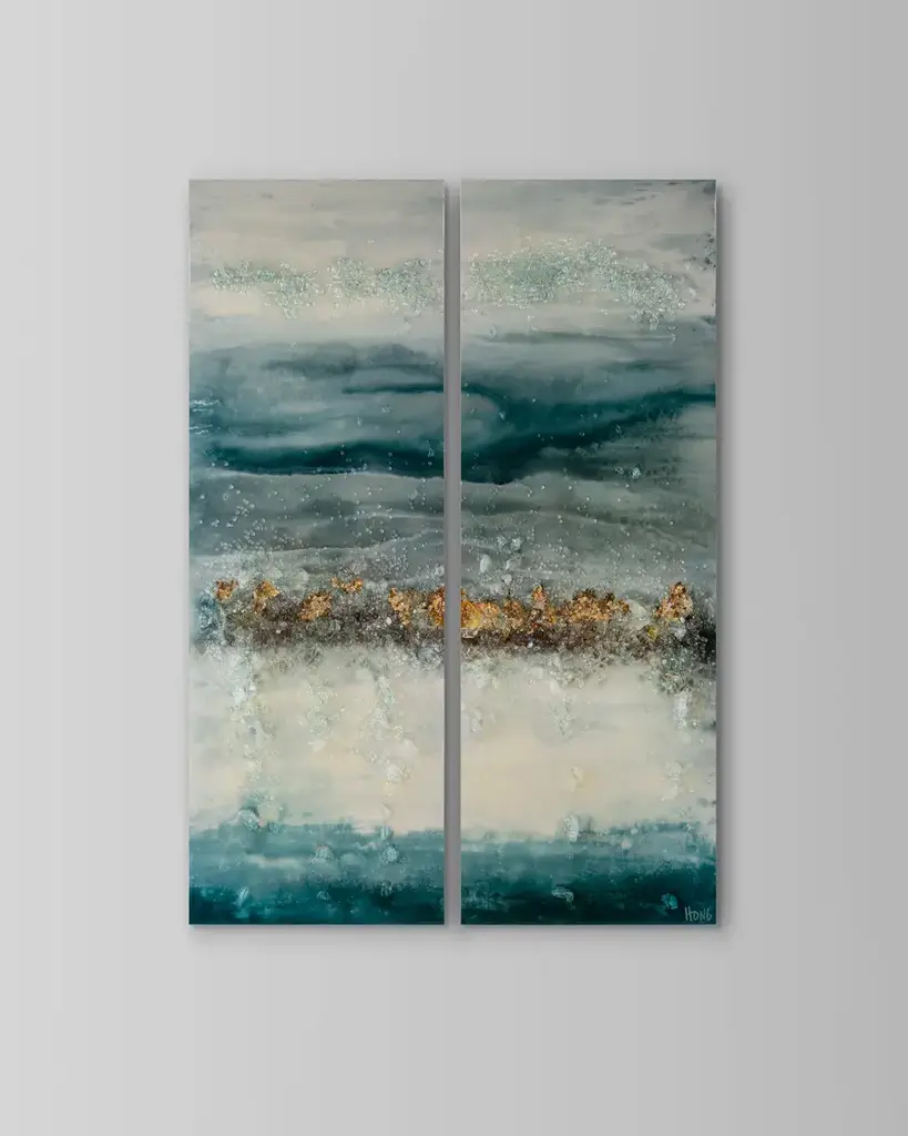 This diptych is taken from Mary Hong's piece "Rolling Thunder". This original giclée features a high gloss vitreous finish and her broken glass signature. Handcrafted painting. Canvas, glass, wood, and resin. Set of two. Each: 21"W x 2"D x 62"T. Feather dust. Made in the USA. Boxed weight, approximately 32 lbs. The acrylic coating on John Richard art is of the highest quality and is meticulously applied. Due to the nature of the process, tiny imperfections may remain on the acrylic surface. These are due to the handmade nature of the product. Avoid direct sunlight since this may cause the acrylic to yellow over time. Clean the art with a dry lint-free cloth. Stubborn stains may be removed using a cloth with mild soap. Dry the art after cleaning with a lint-free cloth. Shipping Direct from Vendor, usually ships within 90 business days. About Mary Hong With Midwestern roots and a lifetime of travel behind her, Mary Hong has found her niche in a unique form of glass mosaic and recycled glass artwork. Think: mosaic meets canvas. It’s fine art mosaics with a wild twist of the unexpected. Mary’s love of art and creativity began with crayons as a toddler and grew to a degree in design from the University of Wisconsin-Madison, workshops, and self-teaching. Her work graces the walls and rooms of many of Florida’s finest homes and establishments, with one-of-a-kind glass panels, wall and window mosaics, and mixed media glass creations. A glass artist for the past 13 years, her newest series is a revisit to tempered glass. “I went through that phase over 10 years ago. I moved into wine bottles, kiln-formed glass, then back and forth thru a gobzillion other mediums but glass has always prevailed. And now, I’m back to the tempered stuff. I crack up the glass (think sledge hammer), dye it, mix it with vintage jewelry, beads, fairy dust, found objects. Sometimes I slather it with gold and silver leaf, then mix it with other shattered remains of lamps, dinnerware, and lately, an old shower door..the stories this glass could tell…” Mary is a member of the Cultural Arts Alliance, the Mattie Kelly Arts Foundation and the Society of American Mosaic Artists (SAMA). Mary is a full-time working artist cracking up glass at Mary Hong Studio/Gallery in Grayton Beach, Florida. About the John-Richard Collection Founded in 1980 in Greenwood, Mississippi, the John-Richard Collection is known for a strong design staff that travels the world for inspiration. Channeling cultural and historical influences, the company creates distinctive artisan-crafted furniture, lighting, wall art, mirrors, and decorative accessories that make a lasting impression. What's more, an eye for future trends in luxury home furnishing sets the John-Richard Collection apart. They skillfully blend the best of what is new in home fashion with the great designs of the past, resulting in updated designs that fit perfectly with an array of styles.