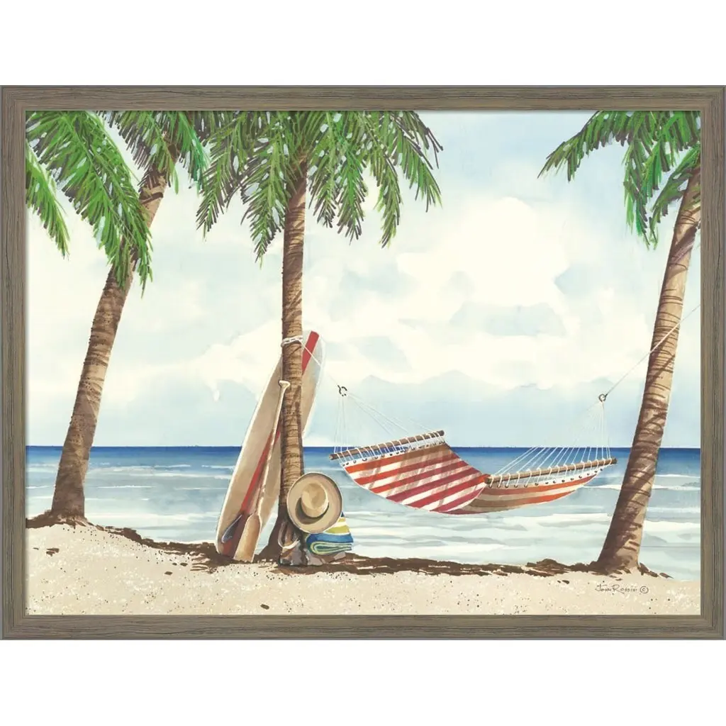 Under the Palms by John Rossini is a high quality piece of framed artwork. The finished size of this piece is 21" X 16". It has a Distressed Grey Knotty Wood frame and is finished with high quality Acrylic Plexiglass. 100% Satisfaction Guaranteed.