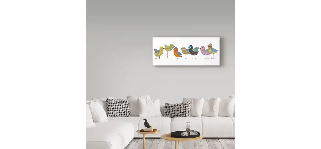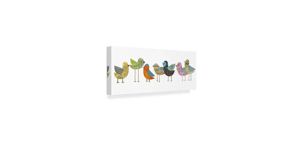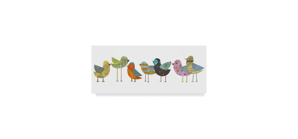 Artist: John W. GoldenSubject: AnimalsStyle: Modern & ContemporaryProduct Type: Gallery-Wrapped Canvas ArtMade in USAThis ready to hang, gallery-wrapped art piece features a group of birds standing across a white scene.Born in 1967, John Golden is the son of a watercolorist mother and a folk singer storyteller father. He loved to draw from an early age, and for that reason, his school work often suffered. When John was 10 years old, his mother opened a gallery to show and sell her watercolors. John spent half of his afternoons in the back room of the gallery, building model buildings out of scrap mat board and the other half wandering the historic city around the gallery. Many historic but decrepit buildings had recently been torn down, so the area was full of scrap materials, found relics and textures, and John developed a love for the unintentional design that exists in urban environments.Giclee (jee-clay) is an advanced printmaking process for creating high quality fine art reproductions. The attainable excellence that Giclee printmaking affords makes the reproduction virtually indistinguishable from the original piece. The result is wide acceptance of Giclee by galleries, museums, and private collectors. Gallery wrap is a method of stretching an artist's canvas so that the canvas wraps around the sides and is secured a hidden, wooden frame. This method of stretching and preparing a canvas allows for a frameless presentation of the finished painting.