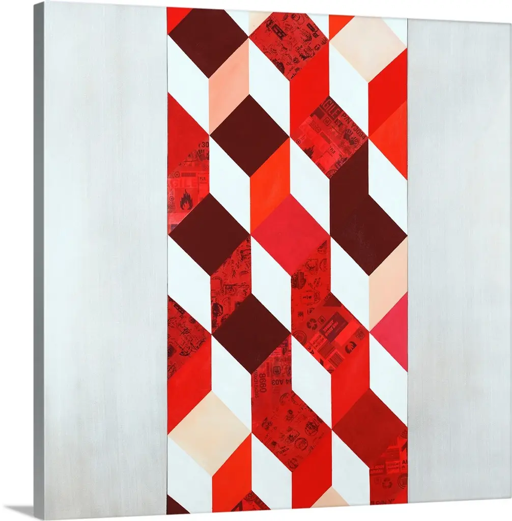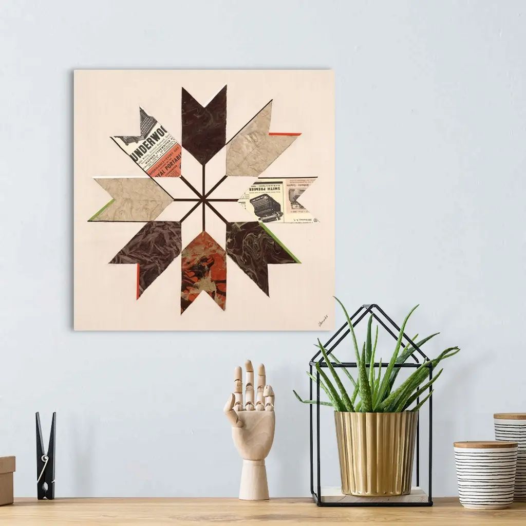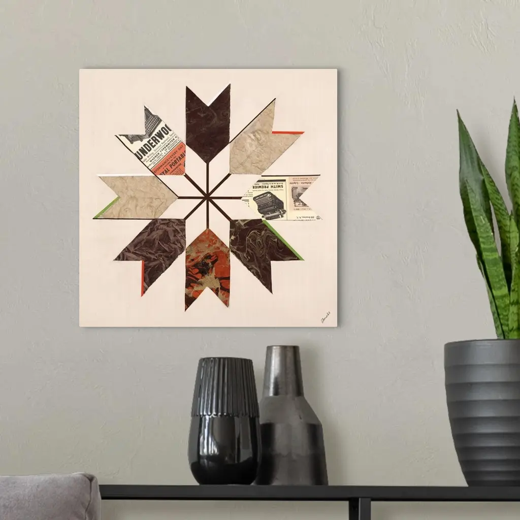 Contemporary painting of a geometric shape with different articles of print in the sections of the shape.