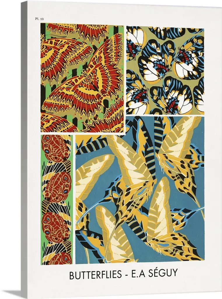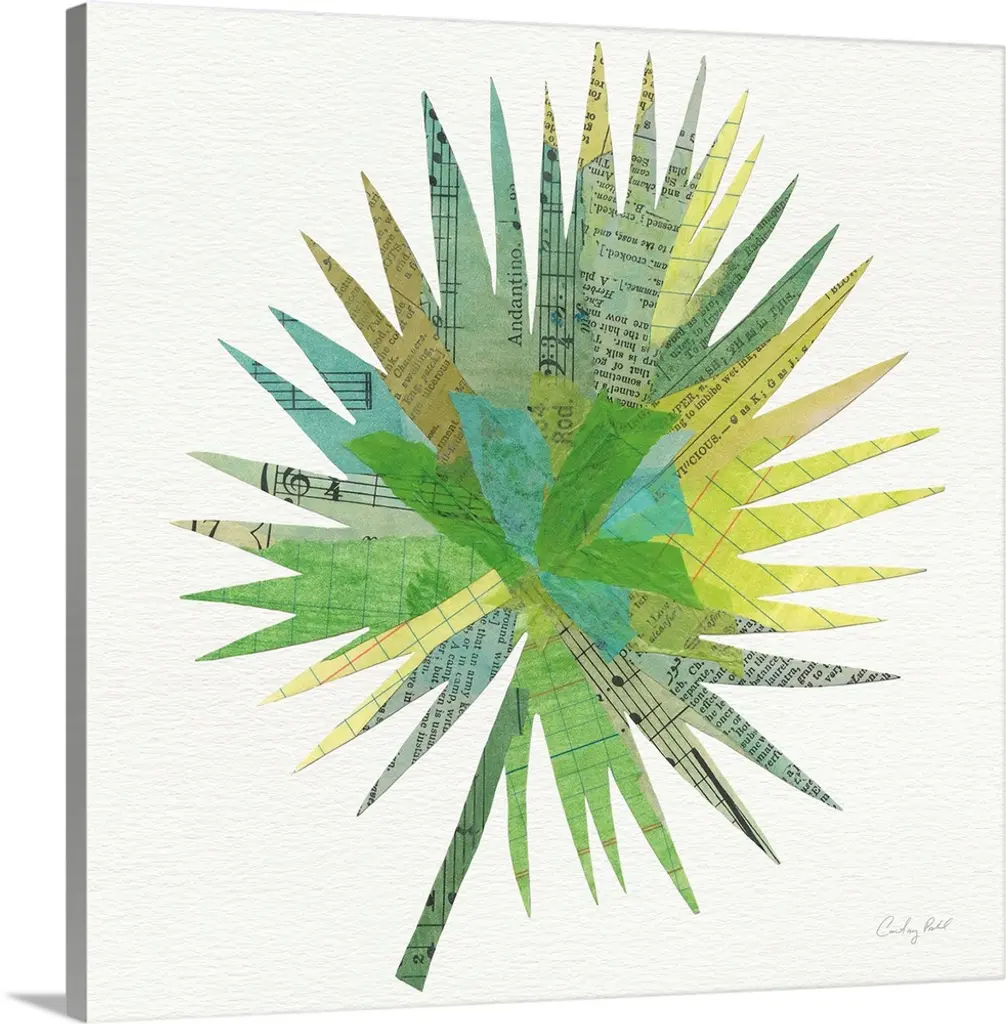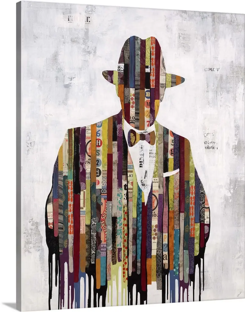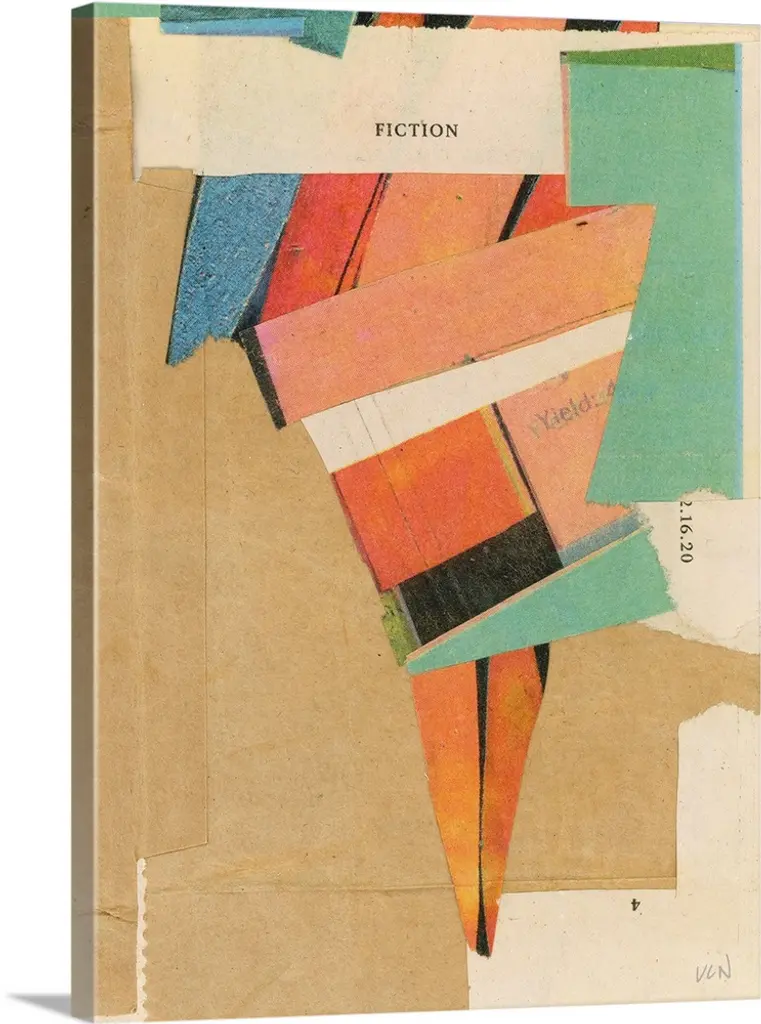 Contemporary painting of a geometric shape with different articles of print in the sections of the shape.