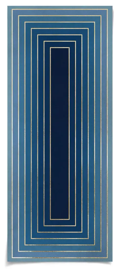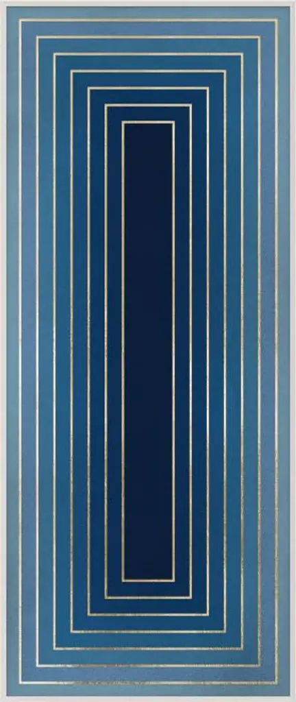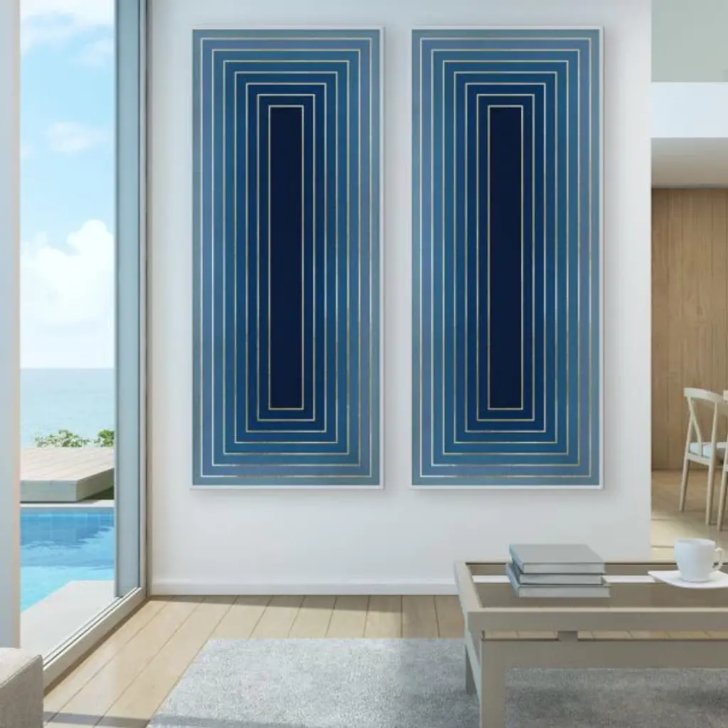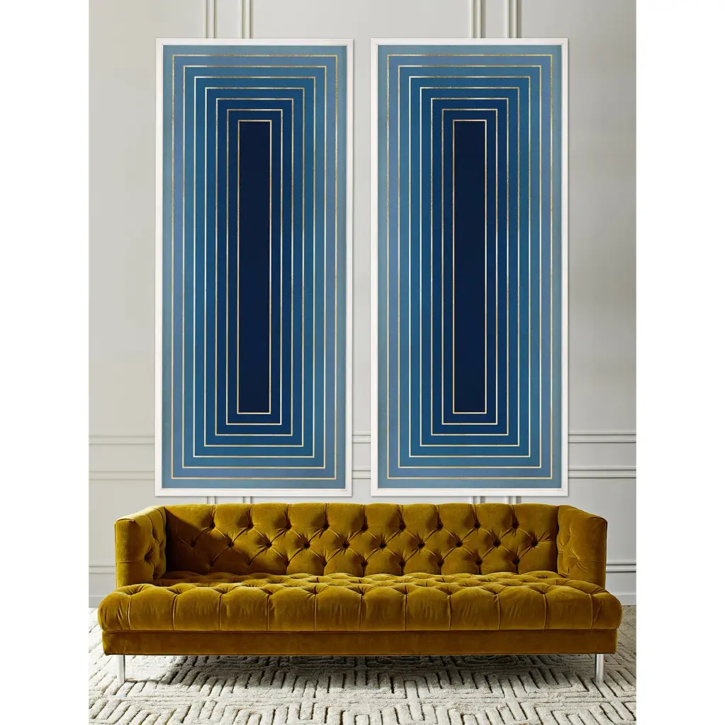 This stunning "Look Within" artwork features rich colors and striking geometry. This contemporary, modern art uses shades of blue and gold to create a large scale abstract design. Printed on Fine Art, acid-free pape. Framing options include an acrylic box or white wooden frame on fine art acid free paper. Also available unframed. Sold individually. Dimensions: Delivery Shipping