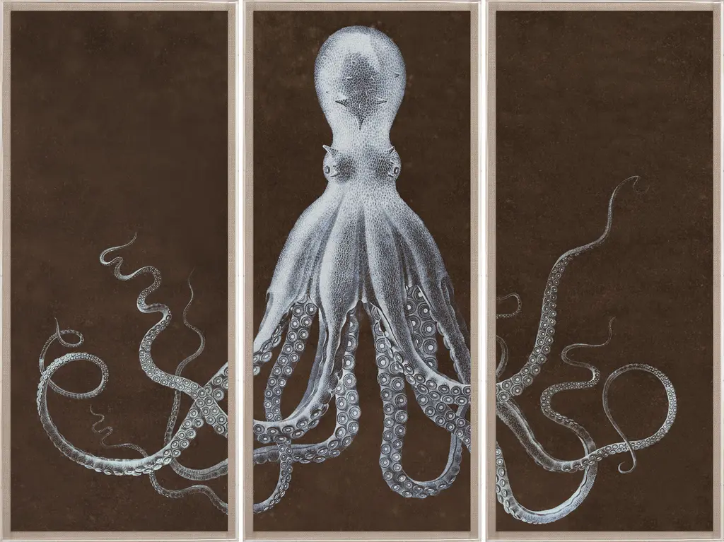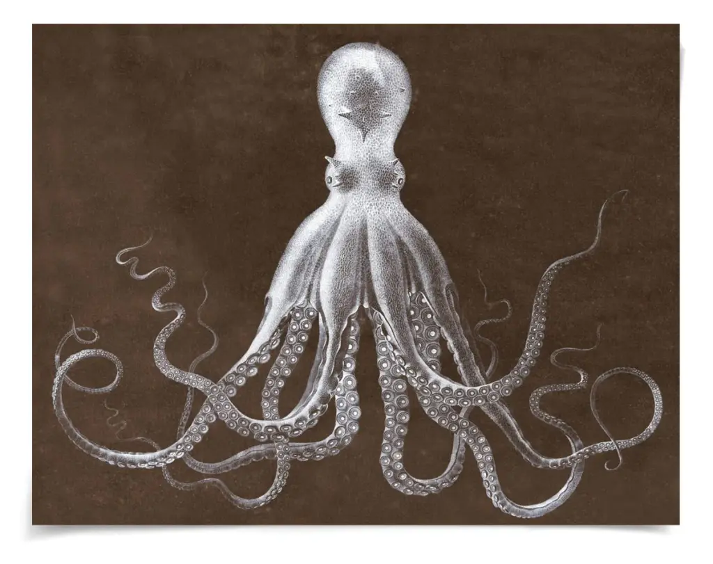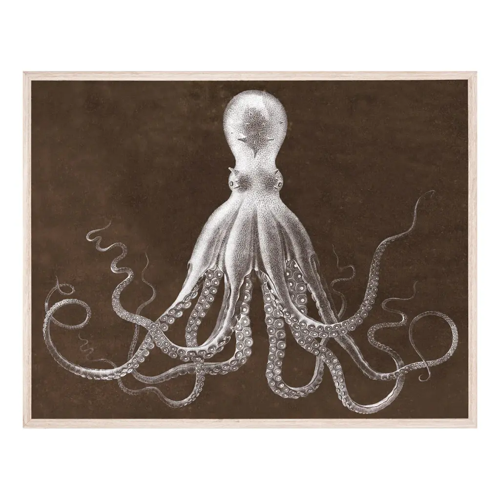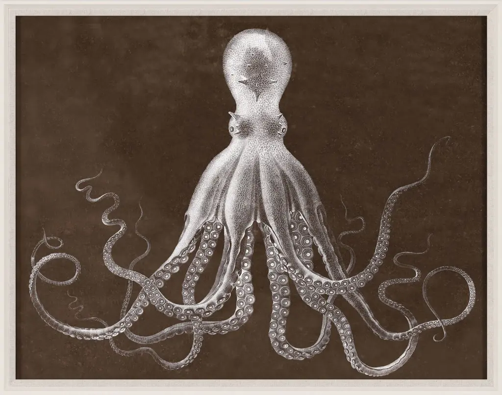 The octopus, a wonderfully bizarre creature from the unfathomed depths, has long been Natural Curiosities' totem animal. These representations of a rigorously articulated 19th-century engraving invoke the haunting, otherworldly magic of this mythic beast. Floated on linen and framed in a custom acrylic or white wood frame. Also available unframed. Sizing Delivery Shipping