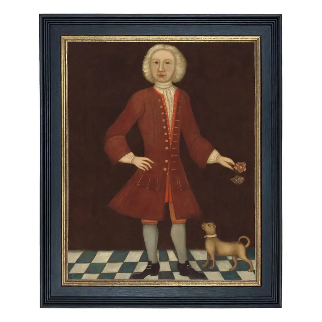 DESCRIPTION Accurately reproduced from the original work, this antiqued print reproduction of Jonathan Bentham, is framed in the proper period frame. FRAMING 2-1/8" Black and antiqued gold with distressed burgundy edge wood and gesso frame Complete with flush-mounted eye hooks and picture wire installed on back. DIMENSIONS Painting Dimensions (in):16x20 Outside Frame Dimensions (in):20.5x24.5 SHIPPING Will ship within 1-3 business days.