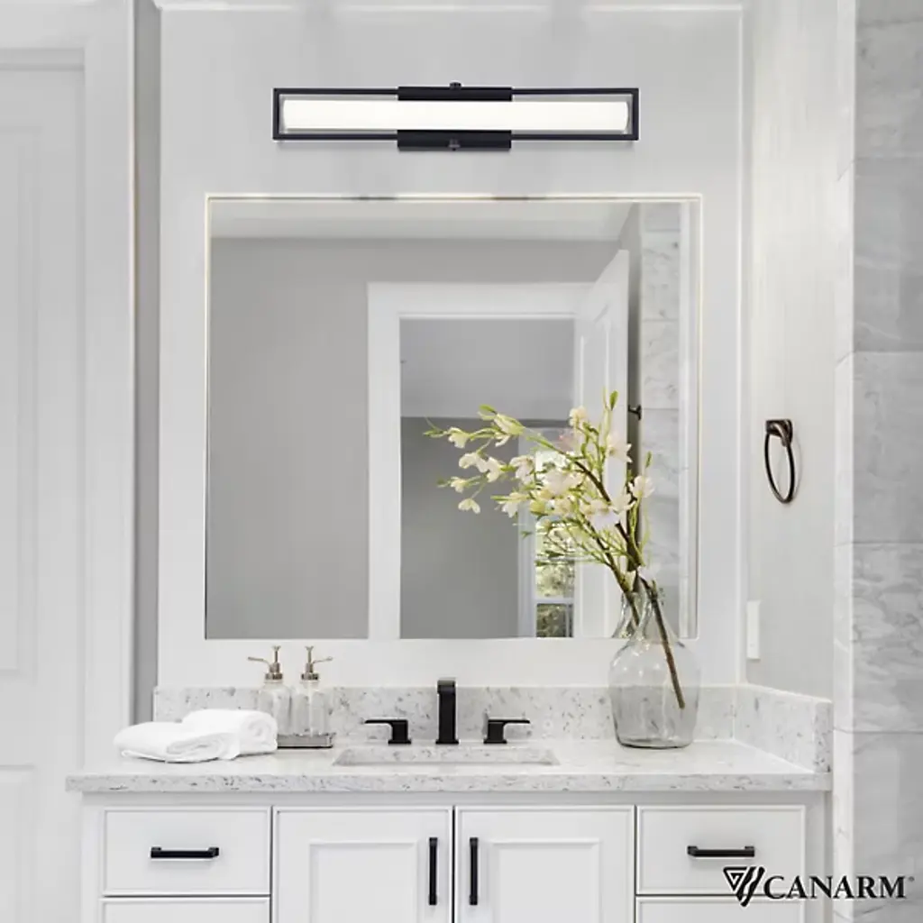 The Jori LED Vanity Light from Canarm brings a modern touch to any bathroom with its sleek, minimalist design. A slender floating frame surrounds an opal glass shade, diffusing soft, even light. This fixture features integrated LED technology for energy-efficient ambiance and provides long-lasting illumination with a contemporary flair. Designed with flexibility in mind, it can be mounted vertically over a mirror or horizontally to either side, depending on the requirements of the space involved.