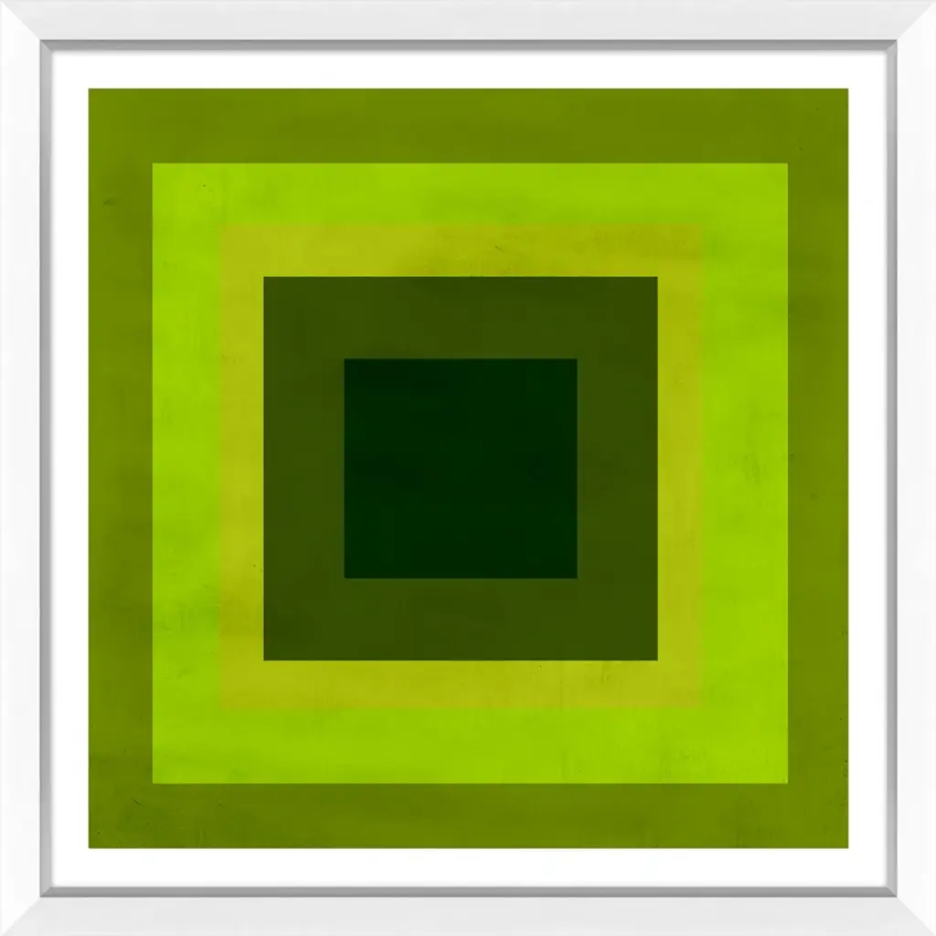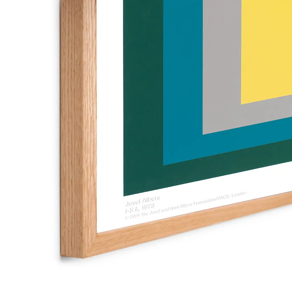 This framed poster features a reproduction of a 1973 work that is part of Josef Albers' seminal Homage to the Square series, a two-decade exploration of colour interaction and his most influential artistic achievement. With mathematically arranged concentric squares in varied hues, this series—spanning over two thousand works—remains a foundational influence on colour theory and art education today. This poster was printed using offset lithographic printing onto 270gsm Rives Sensation Matt Tactile paper. Oak frame. The Josef Albers SP VI Framed Poster measures 27h x 27w x 1"d.