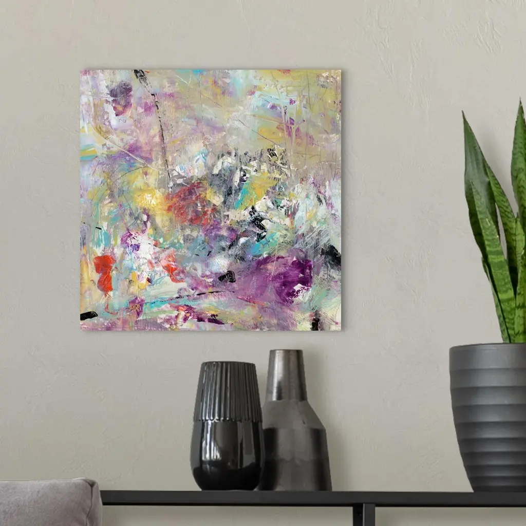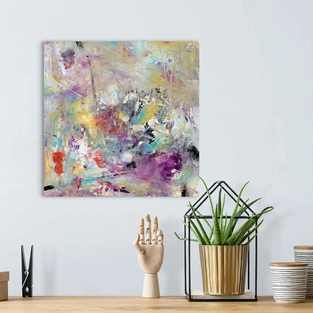 Contemporary abstract artwork in a frenzy of colors and textures, with scratches, brushstrokes, and splatters.