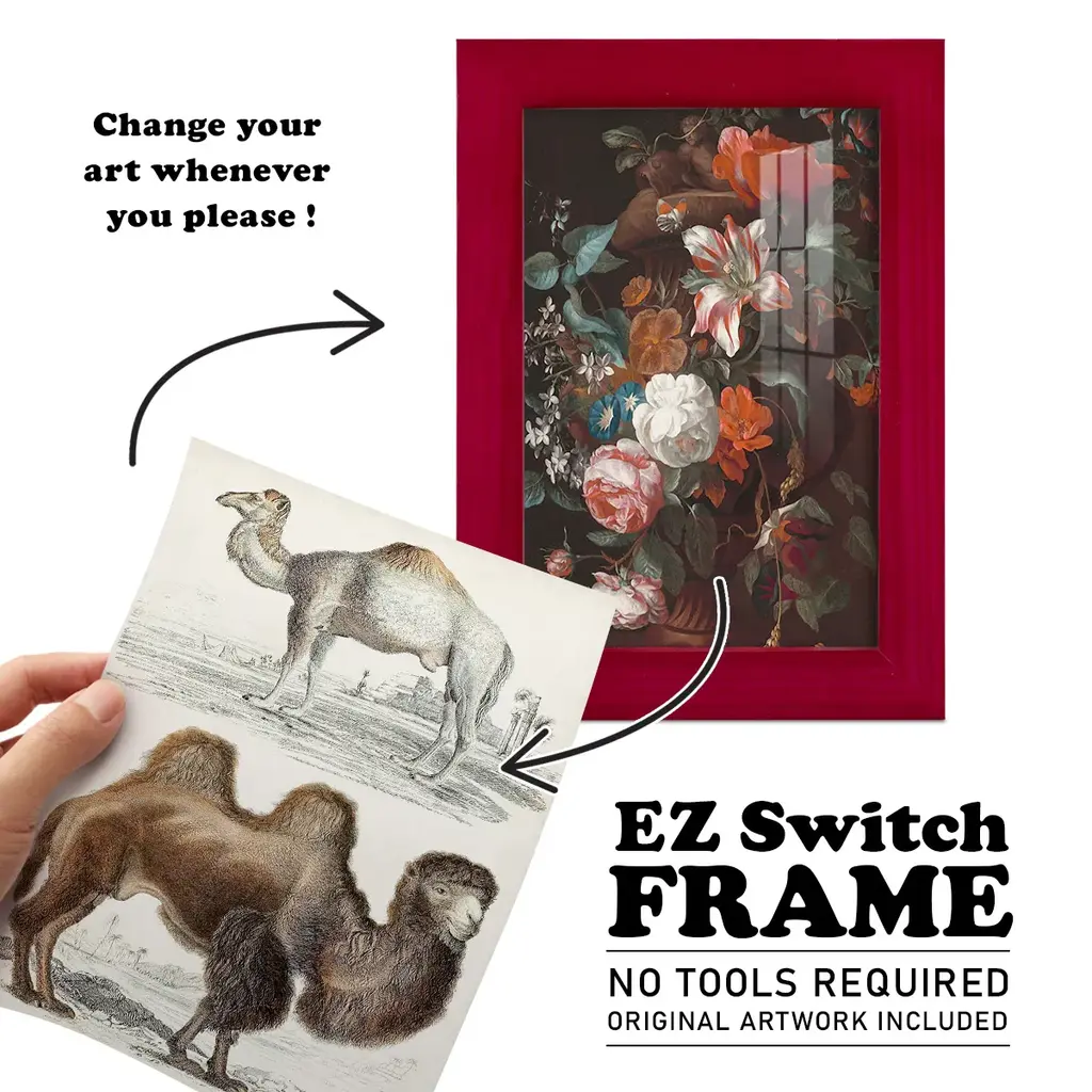Journal of Natural History III -EZ SWITCH Framed Print w/glass-Cherry Red A delightful, framed print. Featuring a solid wood frame with real wood glass. This premium print is giclee quality. In addition, every frame features a removable back and table top stand. This allows you to change your art in the future or to just stand the art on a table for a new look. We are sure you'll enjoy our new series of EZ SWITCH Framed Art. Solid Wood Frame Real Glass Removable / Replaceable Art Built in Tabletop Stand Sizes range from 4x6 up to 12x15 - buy just one or pair them up as sets as you see fit.