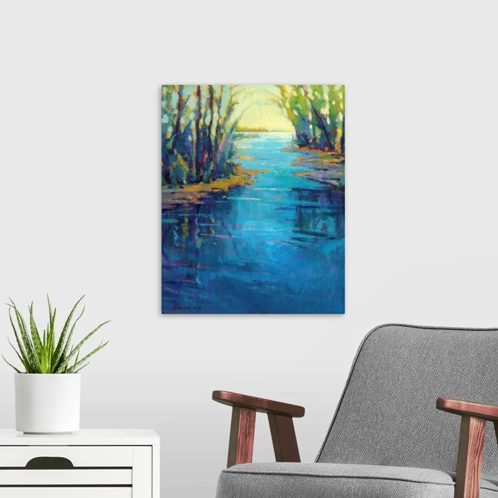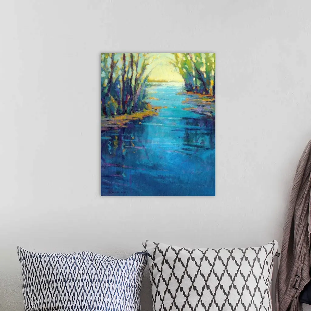A contemporary abstract painting in colorful brush strokes of a river framed by trees.