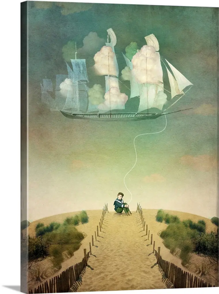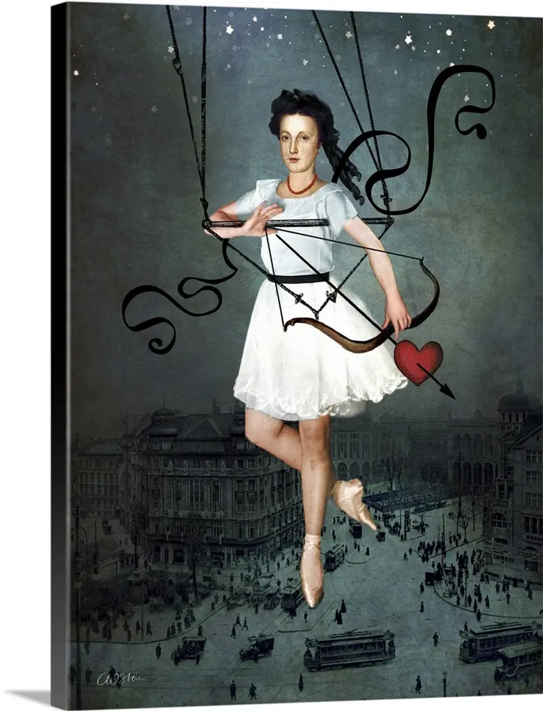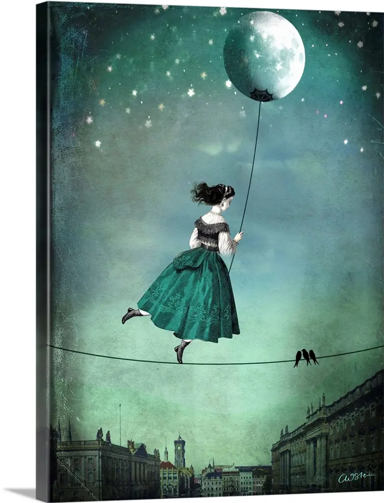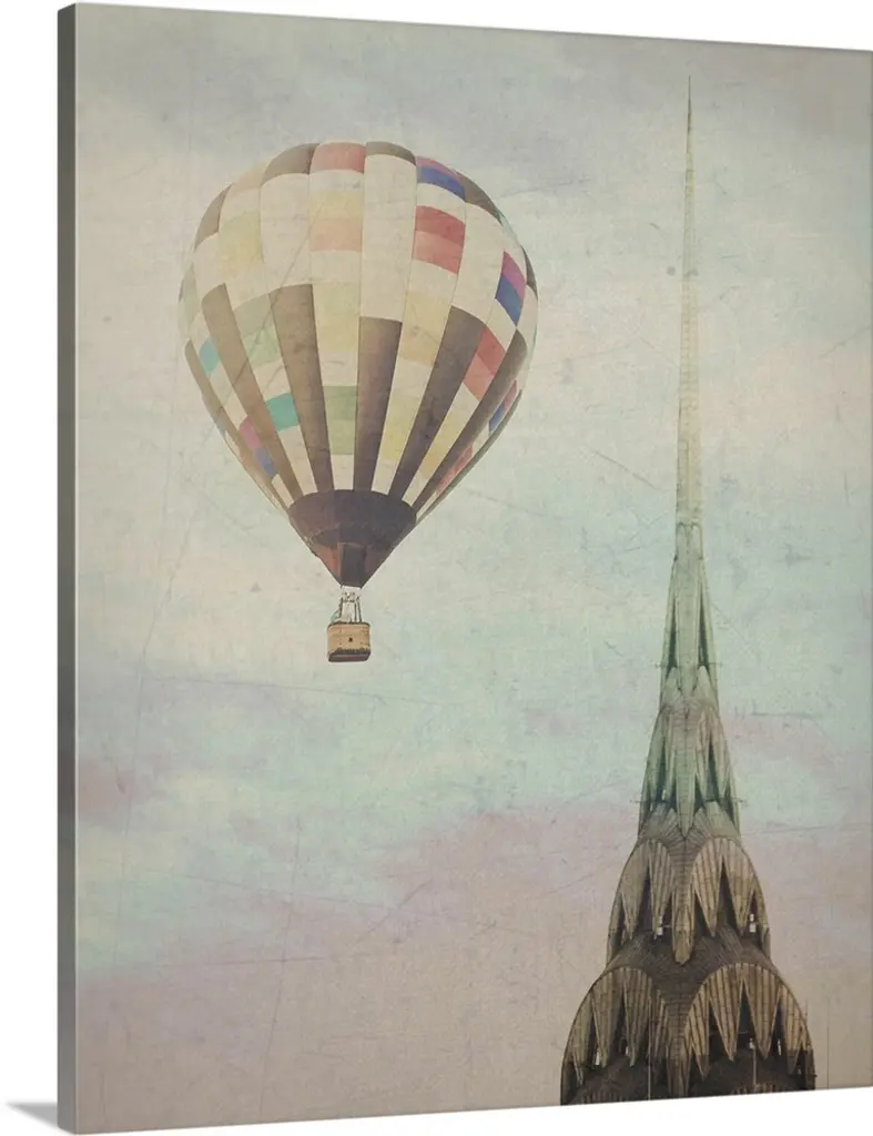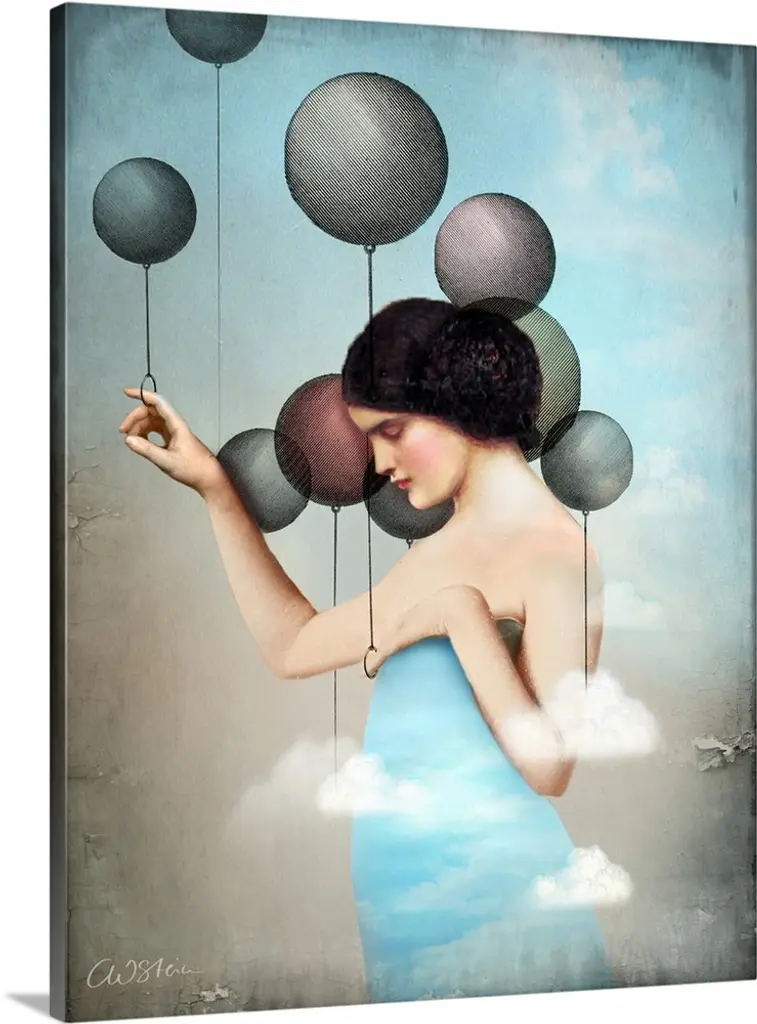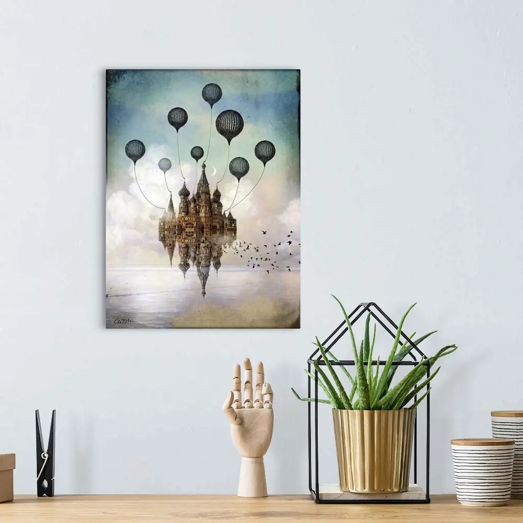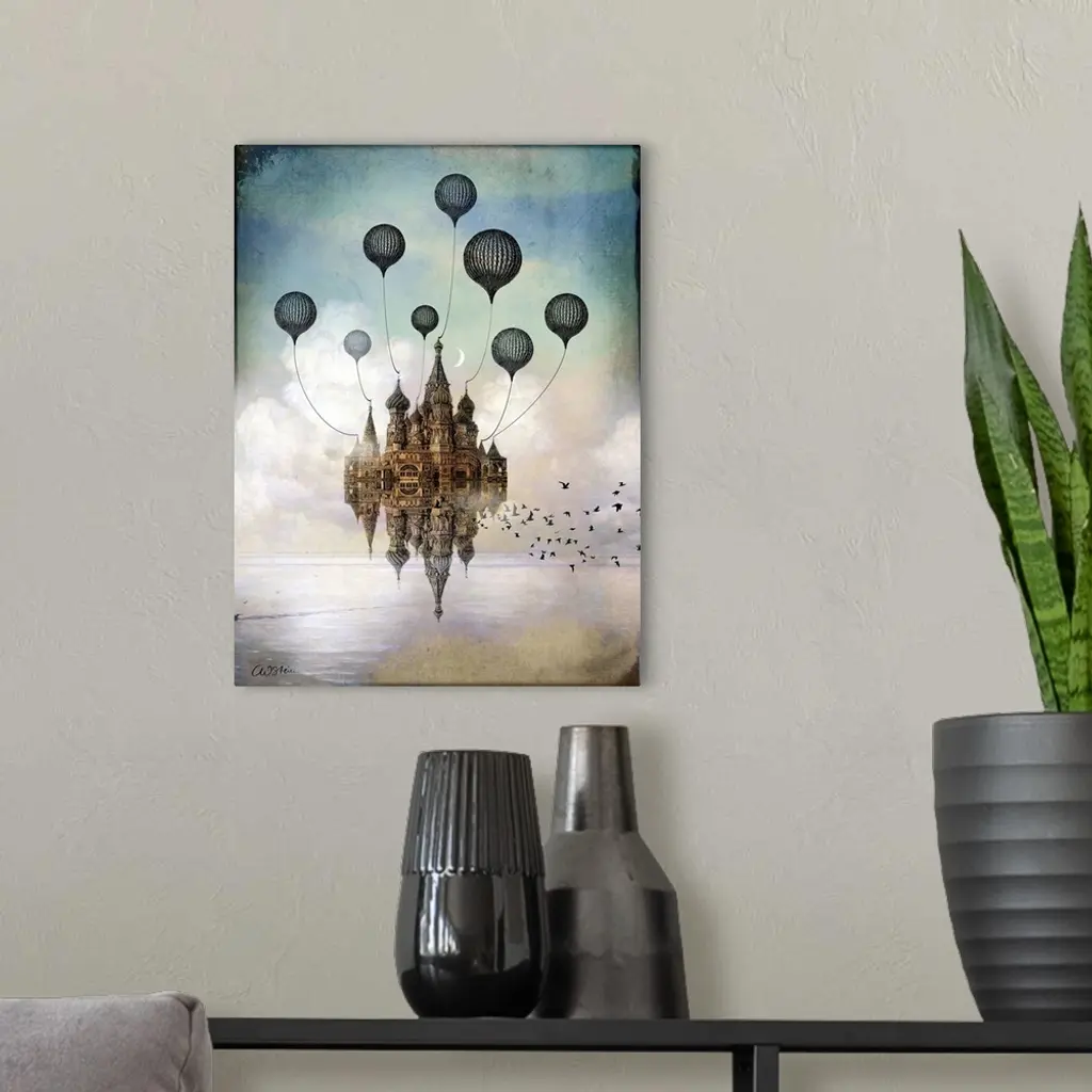 A vertical digital abstract painting of a building floating in the sky with balloons.