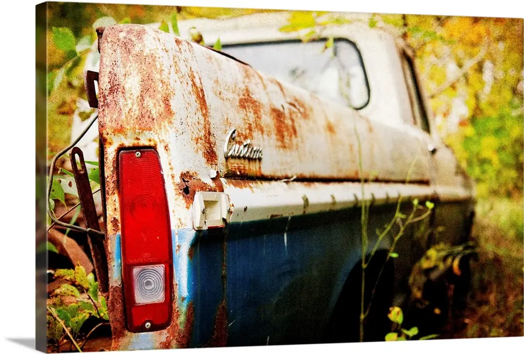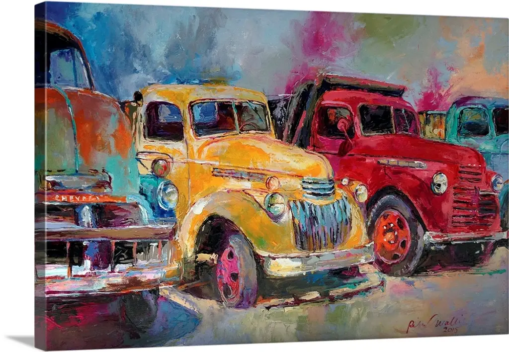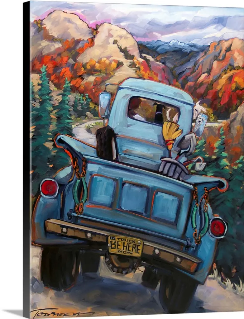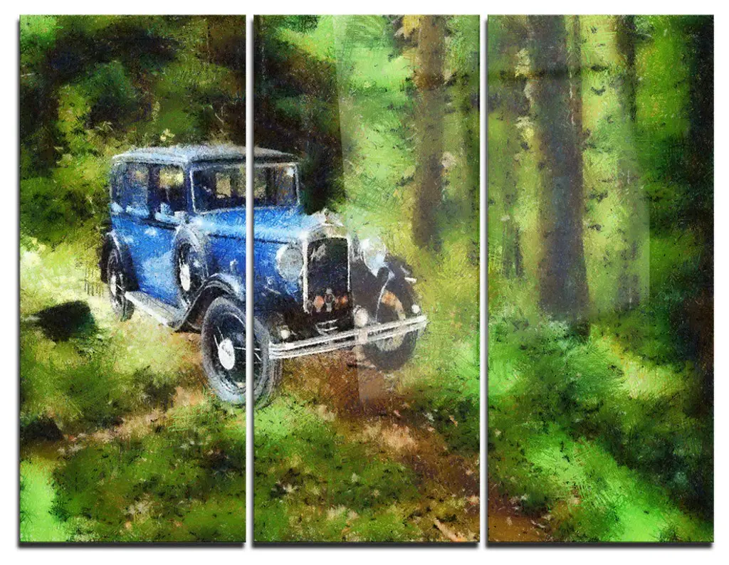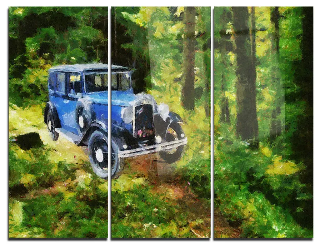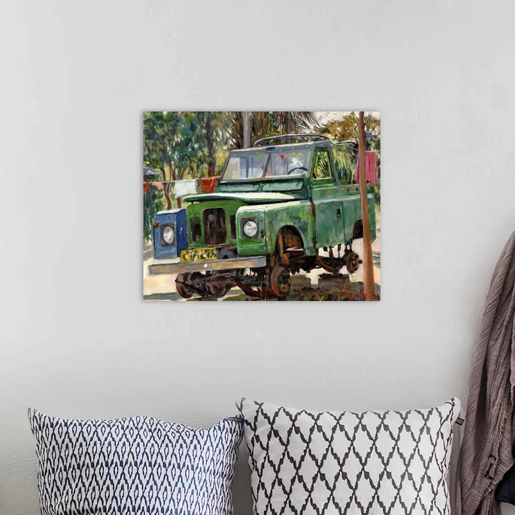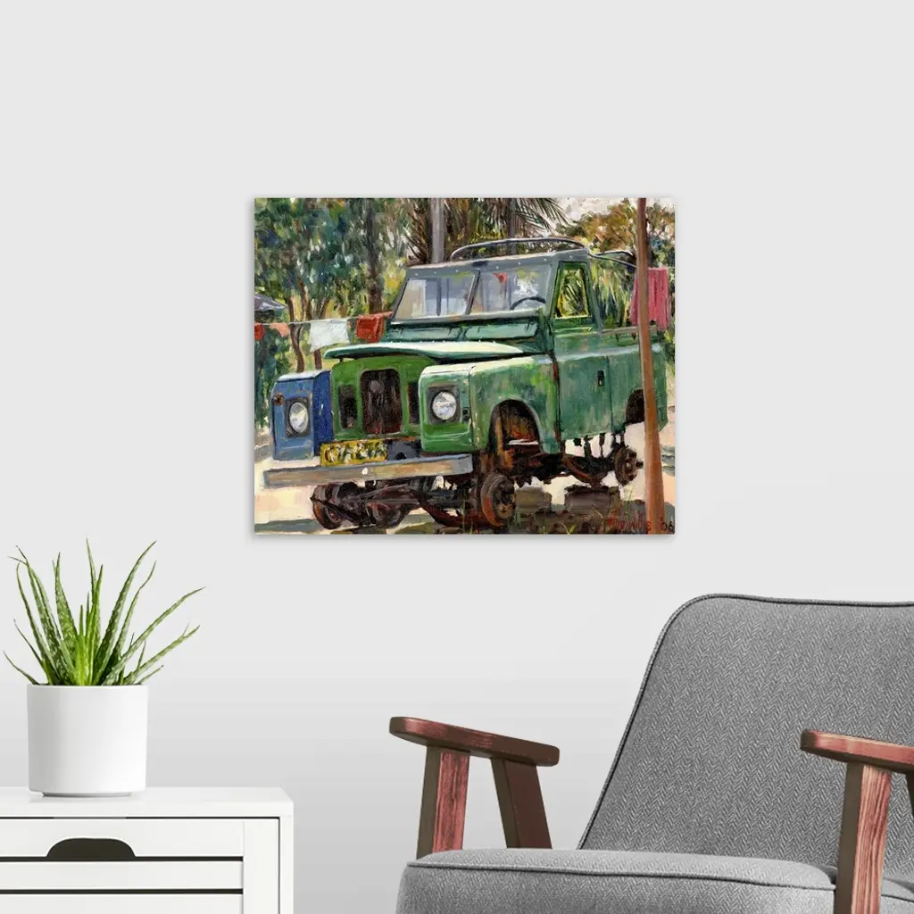Oil painting of broken down car sitting on blocks with tropical backdrop.